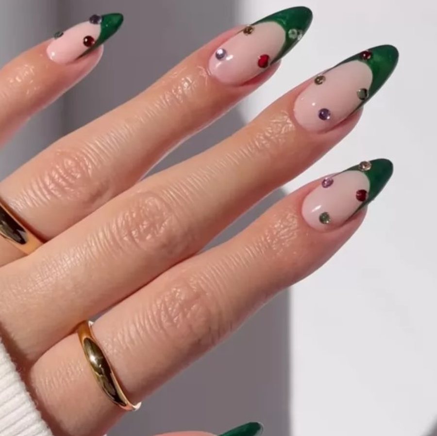 Немного разноцветных камней на зелёной линии - и образ сразу становится праздничным.