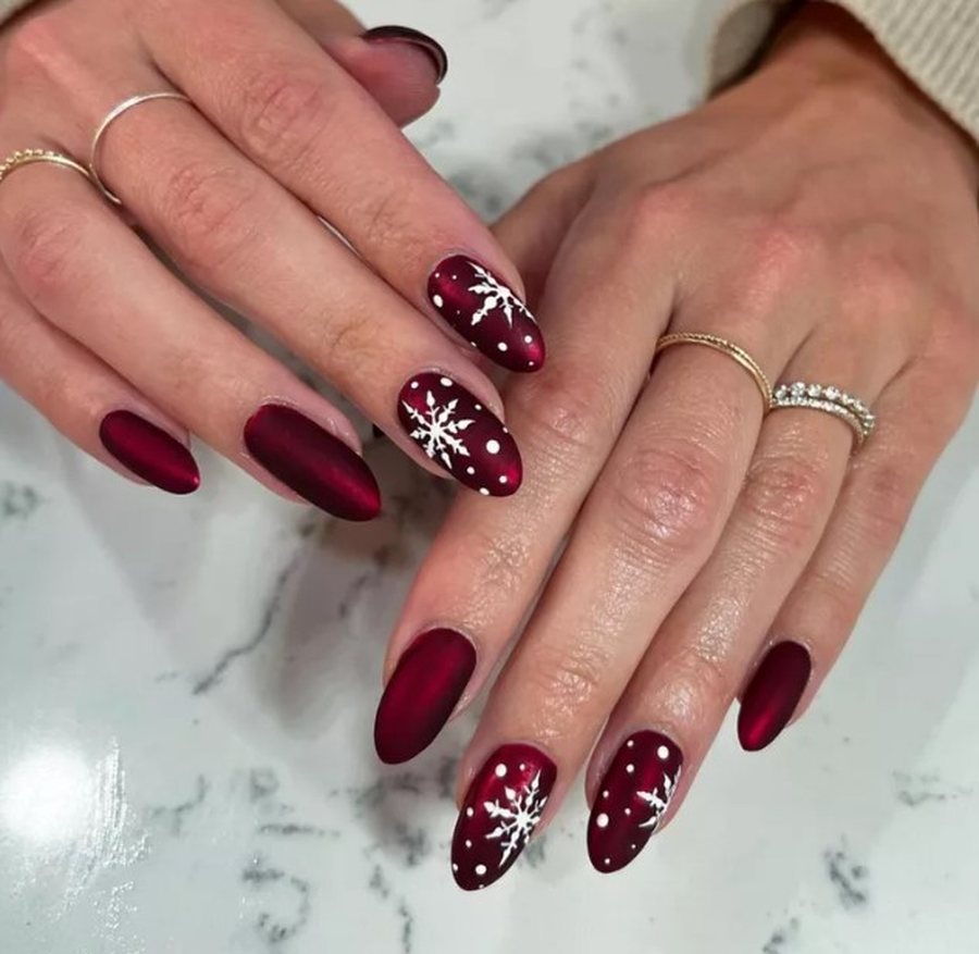 Матовый тёмно-красный с белыми снеговыми завитками - зимний, атмосферный, праздничный.