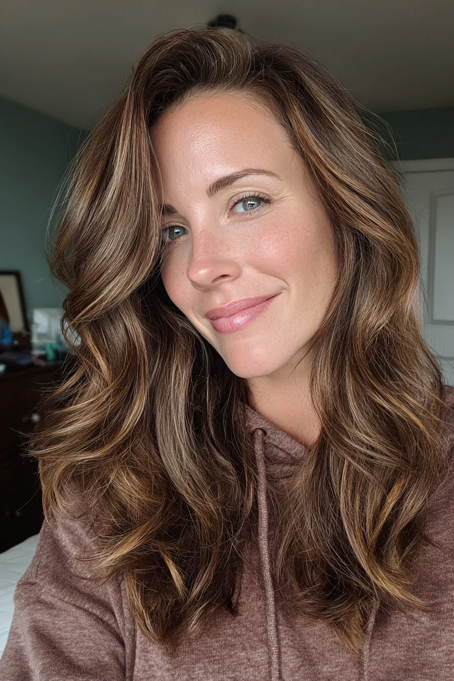Слои распределены так, чтобы естественная волна выглядела аккуратно и равномерно. Карамельные блики добавляют объём и делают текстуру более заметной. Хороший вариант для тех, кто любит естественную укладку и живой рисунок волос.