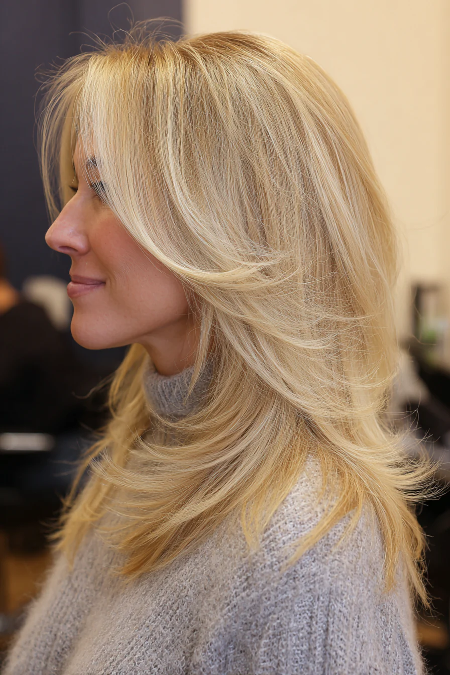 Это вариант для тех, кто не готов расстаться с длиной, но хочет визуально приподнять зону щёк и скул. Длинные слои у лица создают движение и лёгкий объём. Медово бежевый оттенок мягко подсвечивает кожу и делает образ теплее.