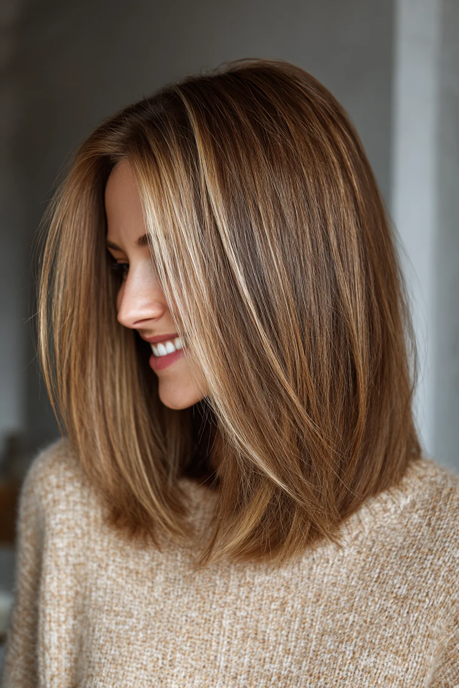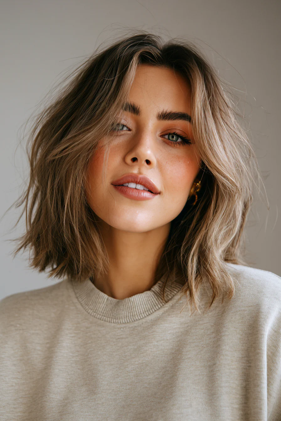Боб с лёгкой шэг текстурой, когда пряди выглядят чуть взъерошенными, а контур остаётся мягким. Медово карамельный оттенок даёт эффект здорового сияния и молодит лицо. Стрижка хорошо подходит тем, кто любит живую, а не идеальную укладку.