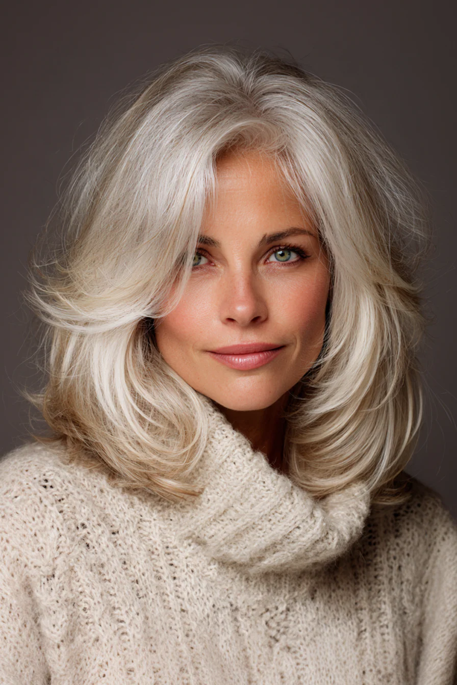 Средняя длина с объёмом в верхней части и лёгкими слоями по длине. Стрижка подходит тем, у кого волосы стали тоньше и хочется визуально добавить плотности. Перламутрово пепельный блонд выглядит благородно, но требует хорошего ухода и грамотного тонирования.