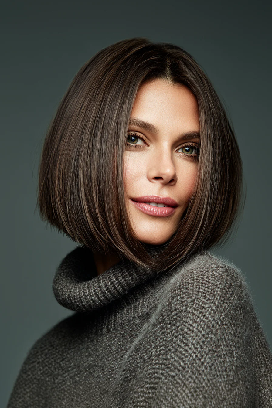 Один чистый срез у линии челюсти делает силуэт графичным и собранным. Важно, чтобы волосы выглядели ухоженными и блестящими. Глубокий чёрный оттенок вороново крыло даёт эффект сильной, выразительной линии и выделяет черты лица.