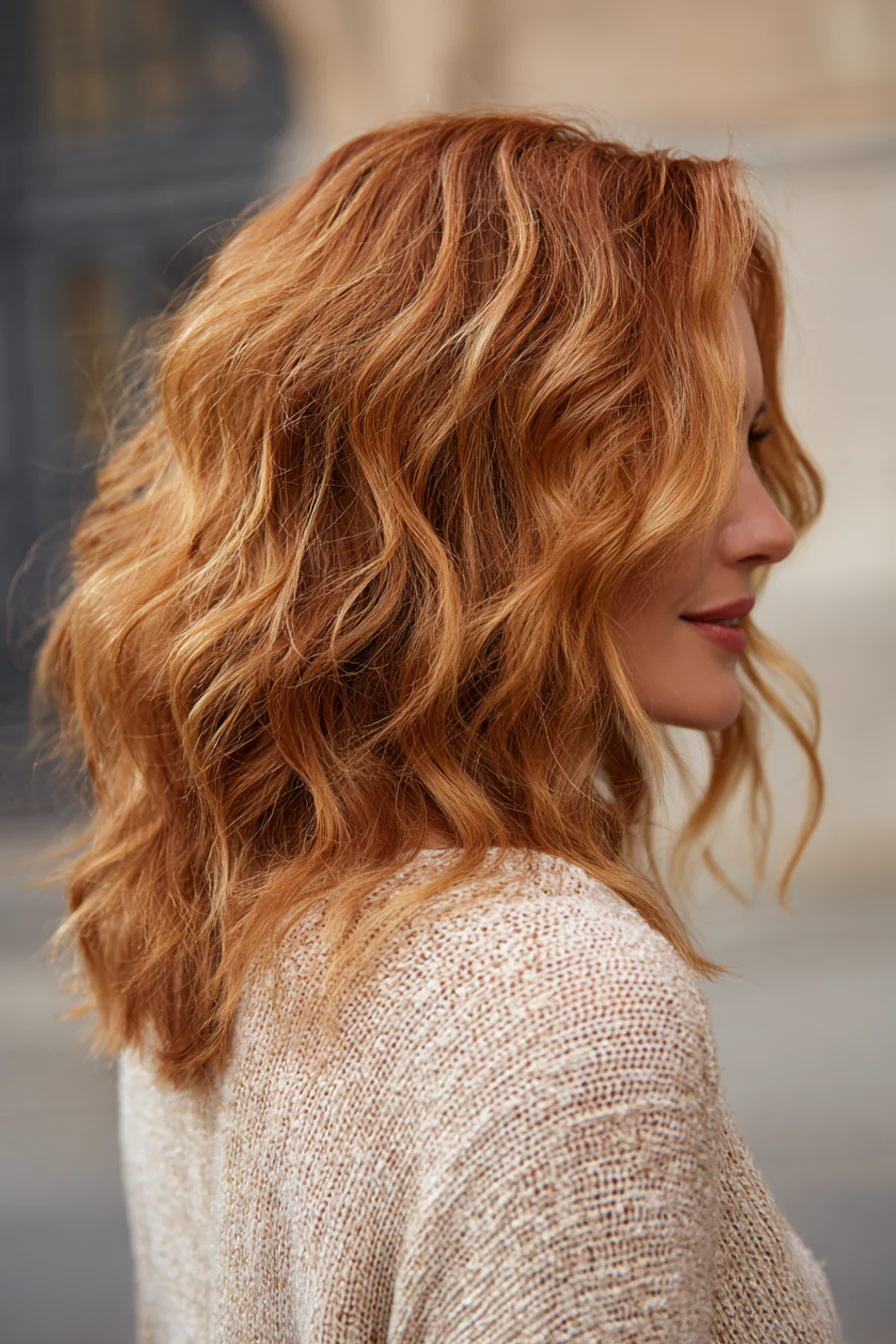 10. Волны до плеч в цвете тёплый кленовый каштан