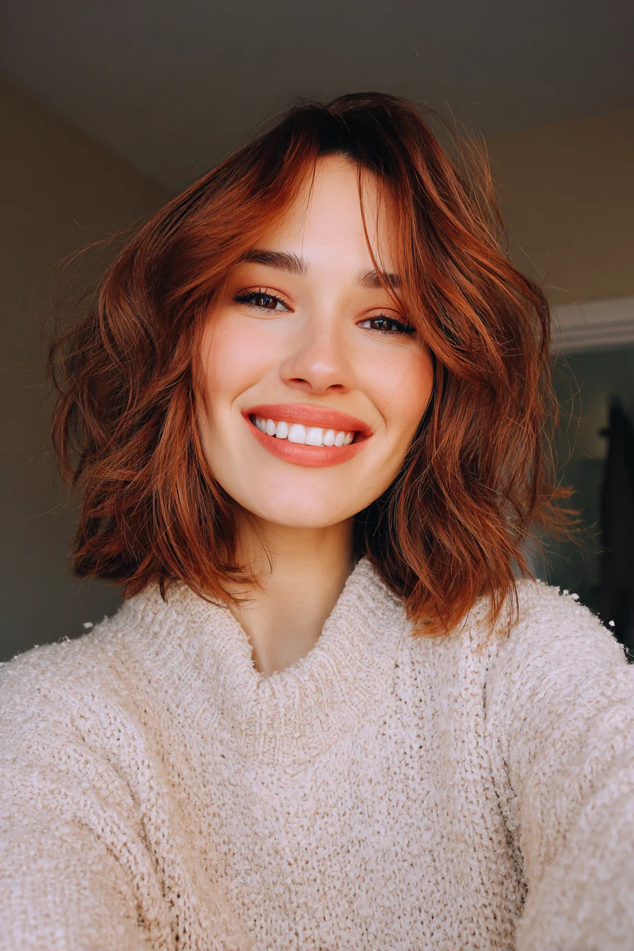 Шэгги лонг боб до плеч даёт объём у корней и лёгкую небрежность по длине. Контур остаётся женственным, а слои делают форму подвижной. Приглушённый рыжевато каштановый тон даёт аккуратный цвет без эффекта «слишком яркой меди» и хорошо смотрится круглый год.