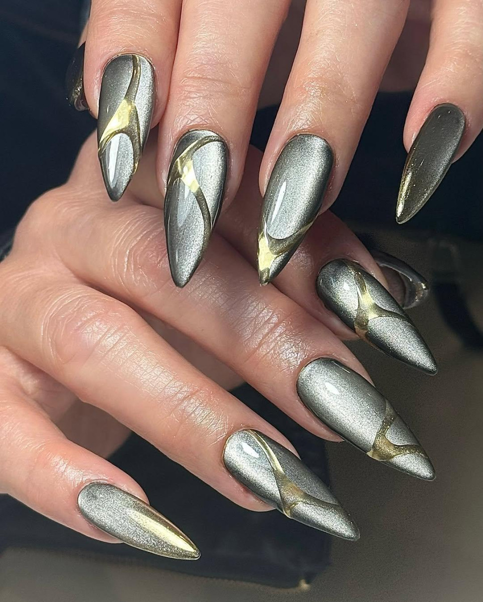 Глубокий серо серебристый фон с эффектом «кошачий глаз» создает бархатистую глубину, а золотой рисунок сверху превращает ногти в маленькие ювелирные изделия. Узор может быть тонким, графичным, похожим на филигрань. Такой маникюр хорошо работает как главный акцент образа, особенно если одежда выдержана в спокойных оттенках. Идея для тех, кто хочет, чтобы руки выглядели максимально нарядно на новогодних фото.