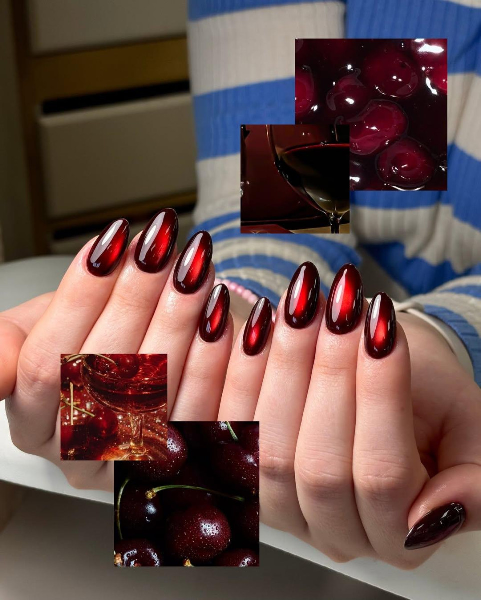 Густой вишневый цвет с глянцевым блеском и магнитной полосой делает ногти похожими на полированный камень. Этот вариант выбирают те, кто любит классику, но хочет добавить ей немного драмы. Вишневый «кошачий глаз» красиво смотрится с темными костюмами, бархатными платьями, кашемировыми свитерами, подчеркивает уверенность и собранность образа.