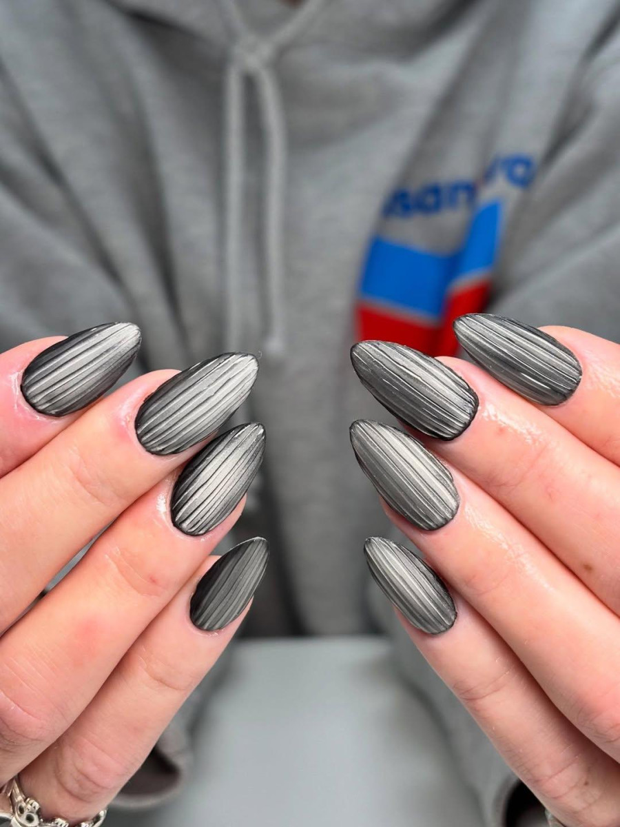 Темный графитовый или почти черный цвет в сочетании с холодным серебристым «кошачьим» бликом дает эффект жидкого металла. Ногти словно подсвечены изнутри, а магнитная полоса создает ощущение движения. Это отличный выбор для тех, кто любит минималистичный гардероб и четкие линии, но хочет добавить образу немного мистики и рок н ролльной энергетики.