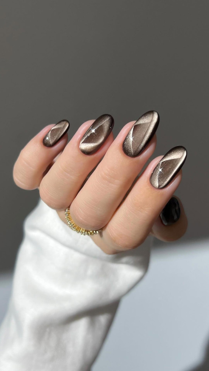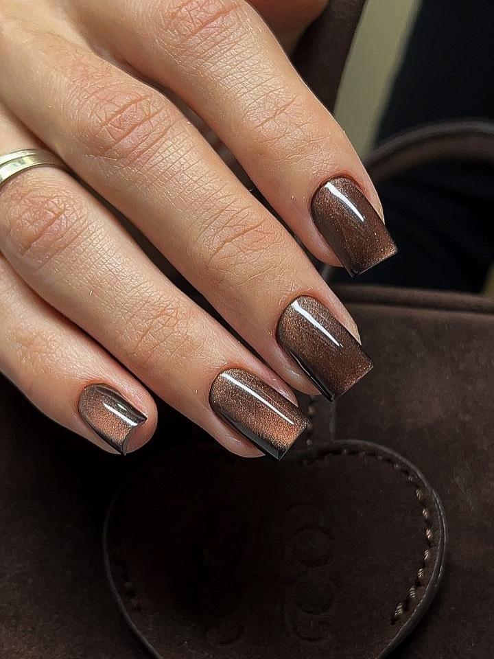 Теплый шоколадный оттенок с легким вельветовым сиянием ассоциируется с пледом, горячим напитком и зимними вечерами. Магнитный блик добавляет глубину и мягкий объем, из за этого ногти выглядят ухоженно и дорого даже в самой простой одежде. Такой маникюр идеально подходит тем, кто предпочитает спокойную палитру, но не готов отказываться от эффекта «вау» при каждом движении рукой.