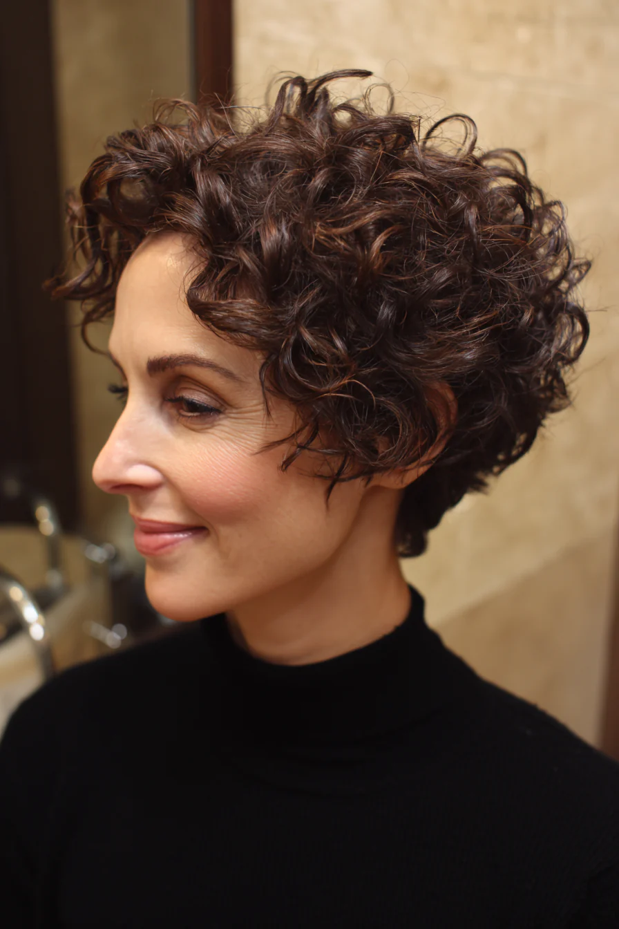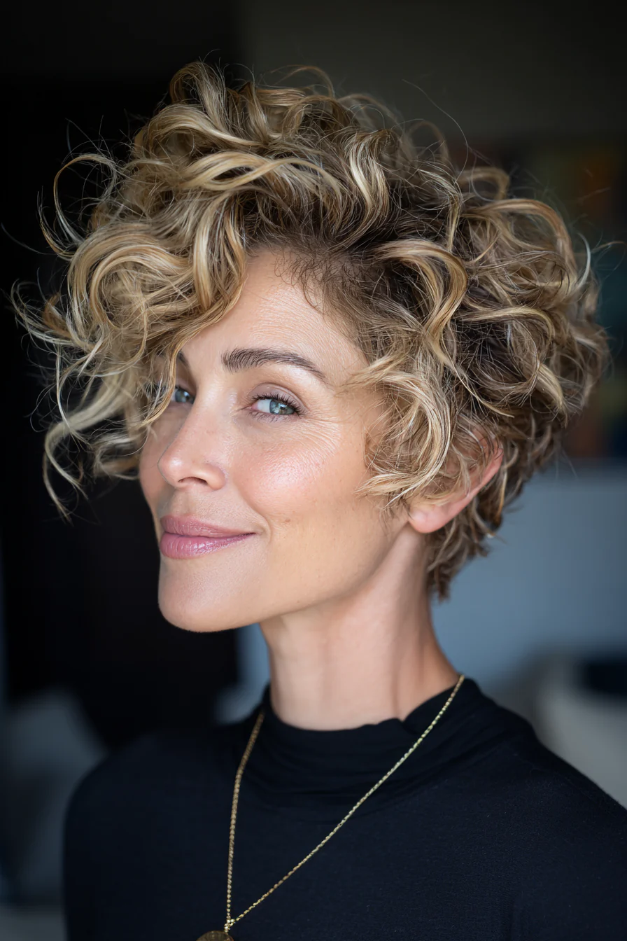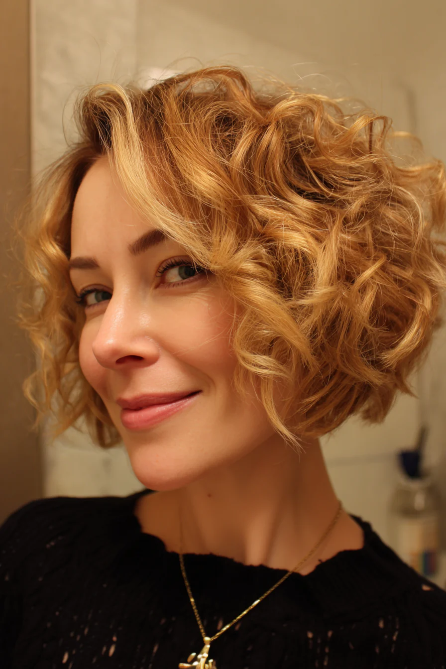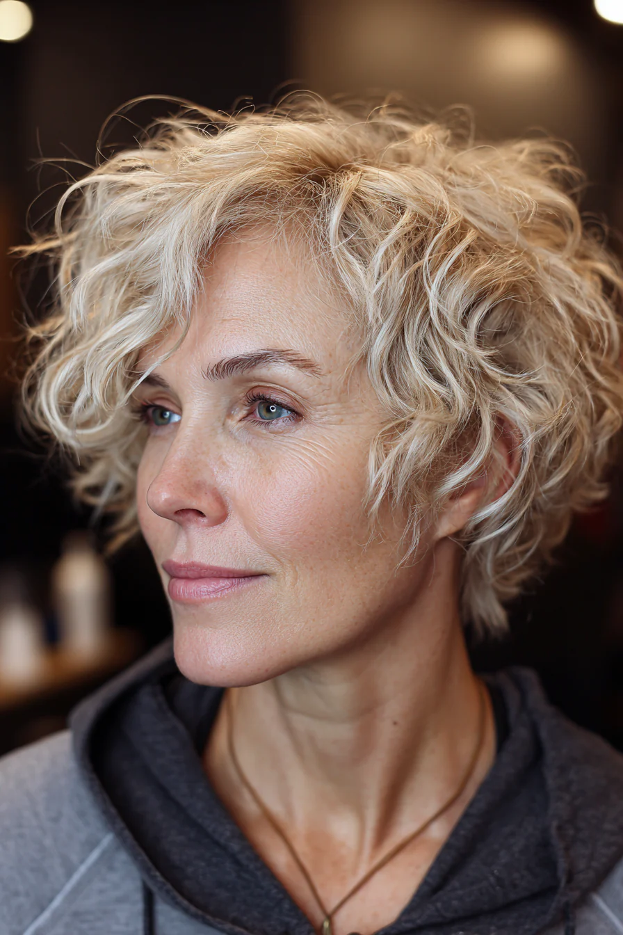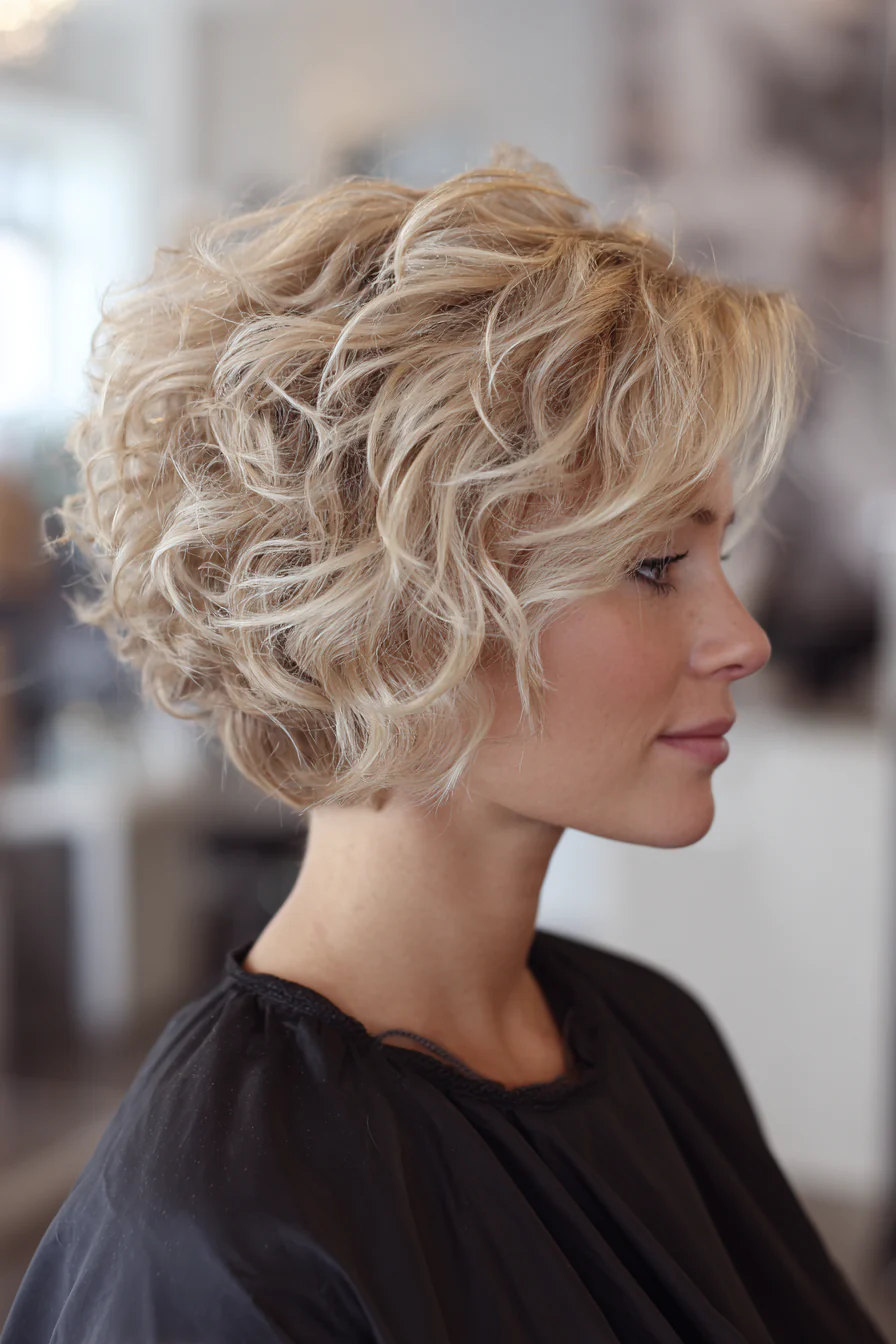 Коротко, свежо, с лёгкой «взъерошенностью», которая выглядит намеренно. Тёмный блонд подчёркивает текстуру и делает кудри визуально плотнее. Отличный выбор, если нужен стиль без долгих укладок.