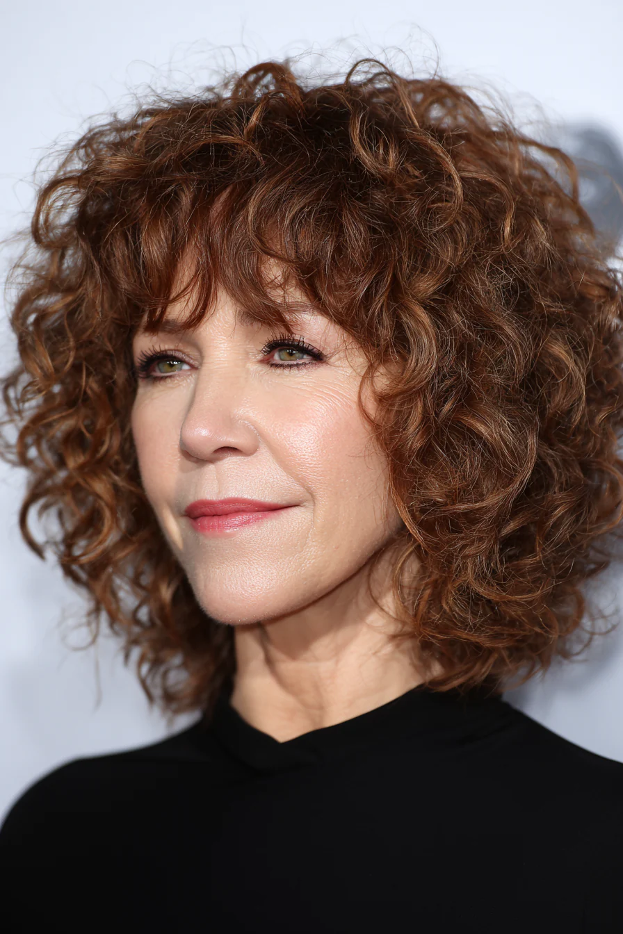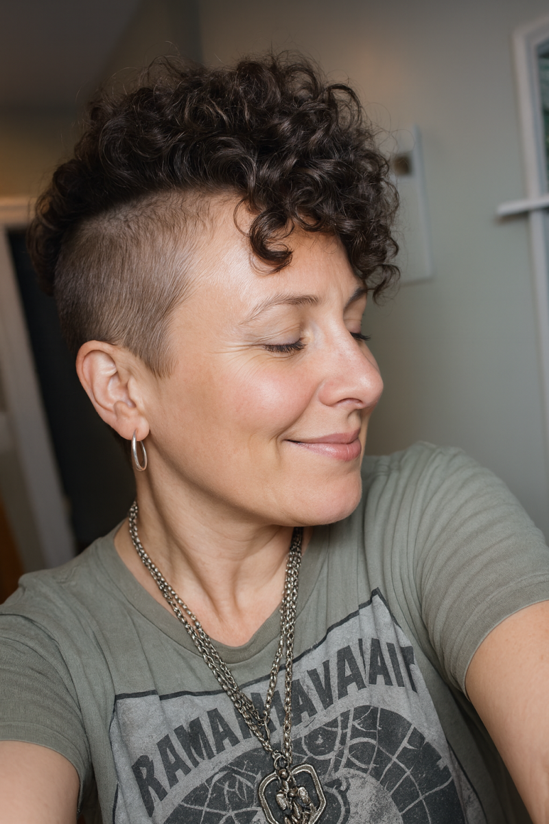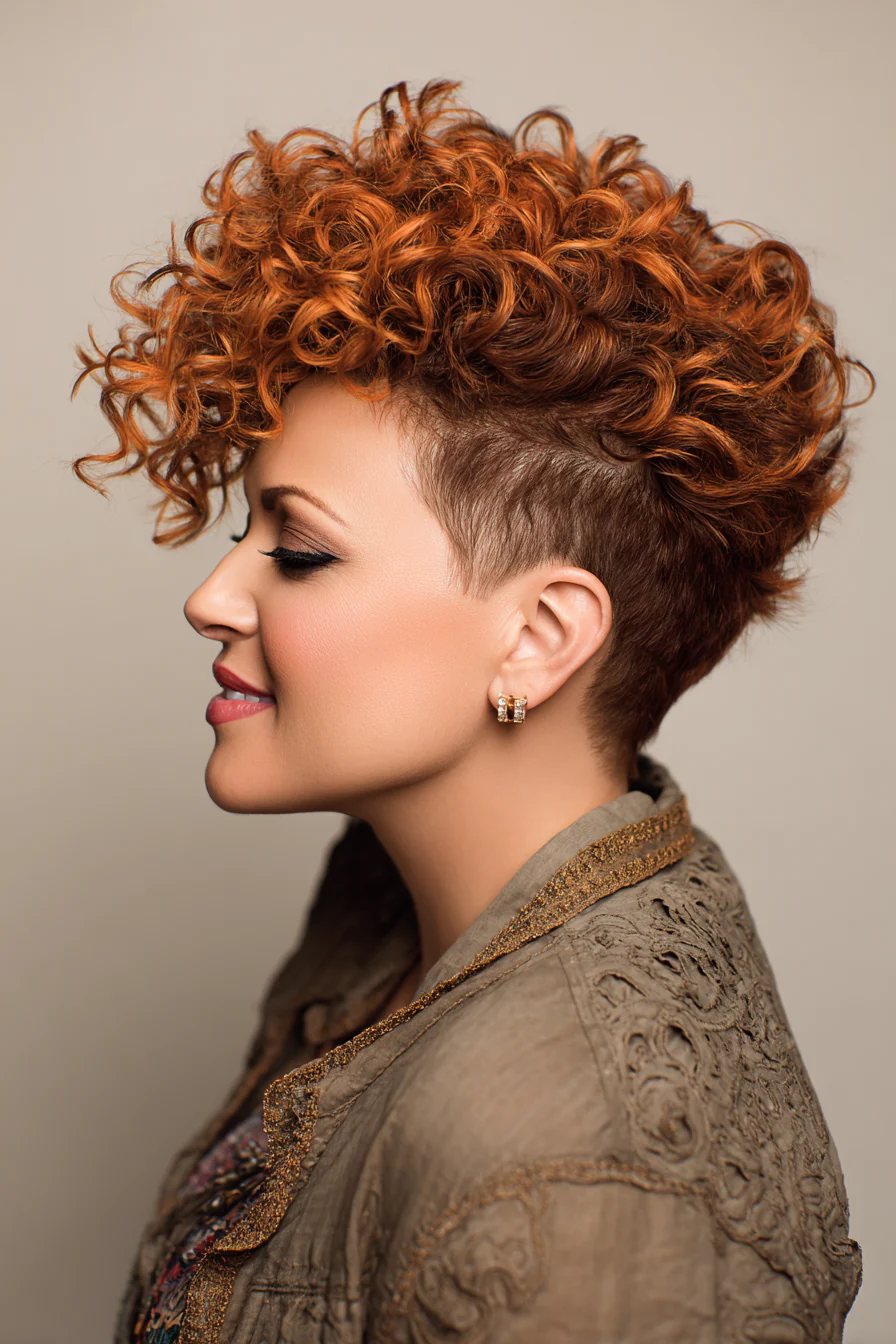 Выбритые виски и затылок дают чёткий силуэт, а верх оставляют кудрявым и высоким. Медно-каштановый оттенок добавляет глубины и тепла, кудри выглядят более «скульптурными». Отличный вариант, если хочется структуры, но без жёсткости.