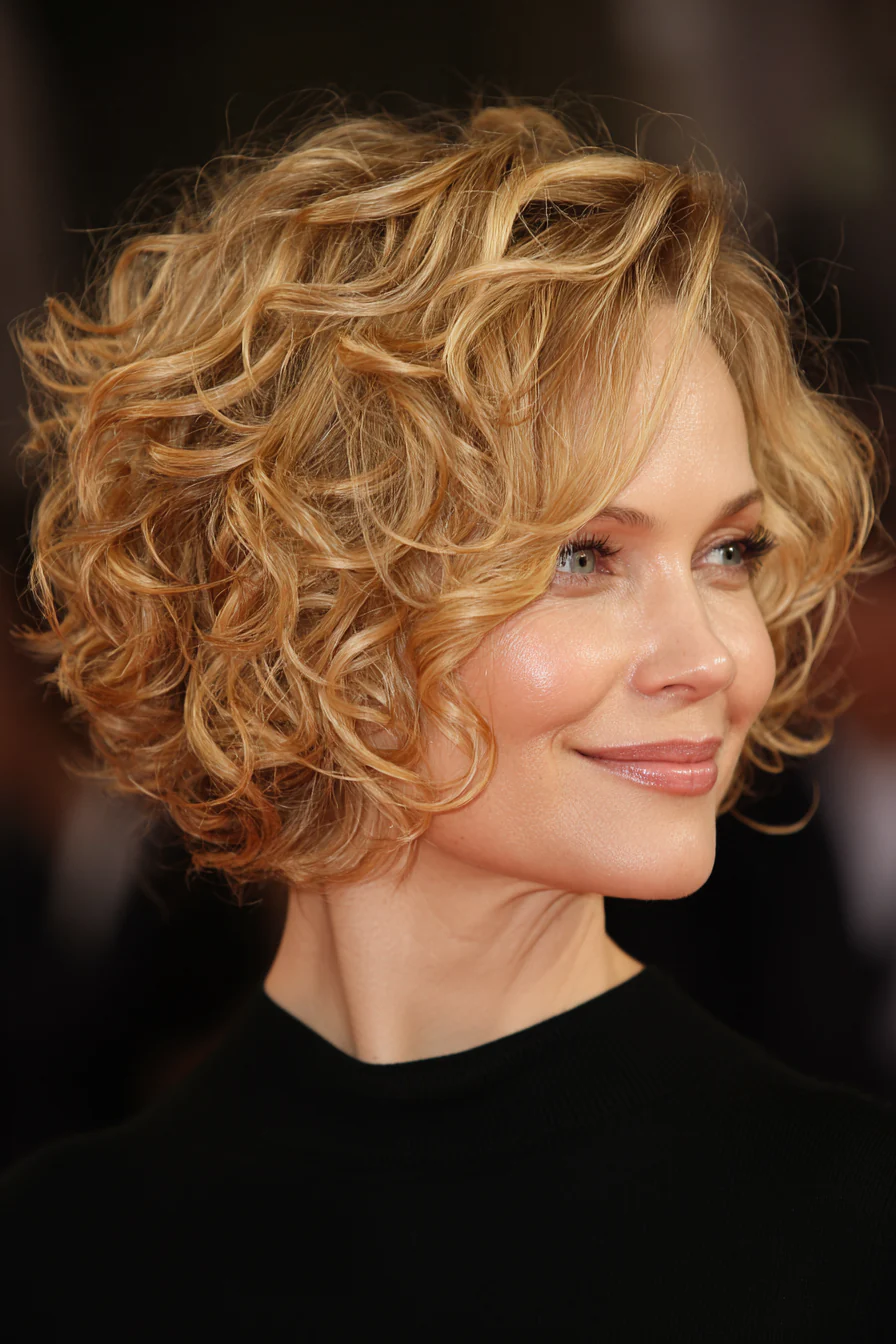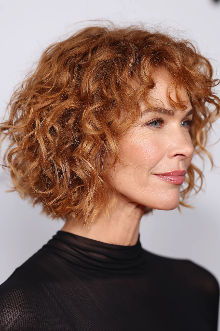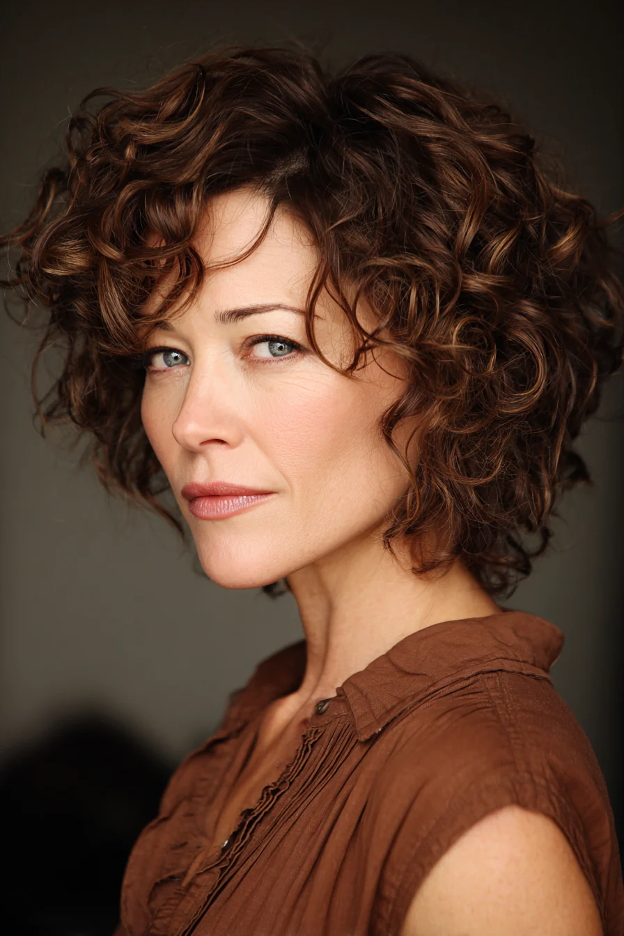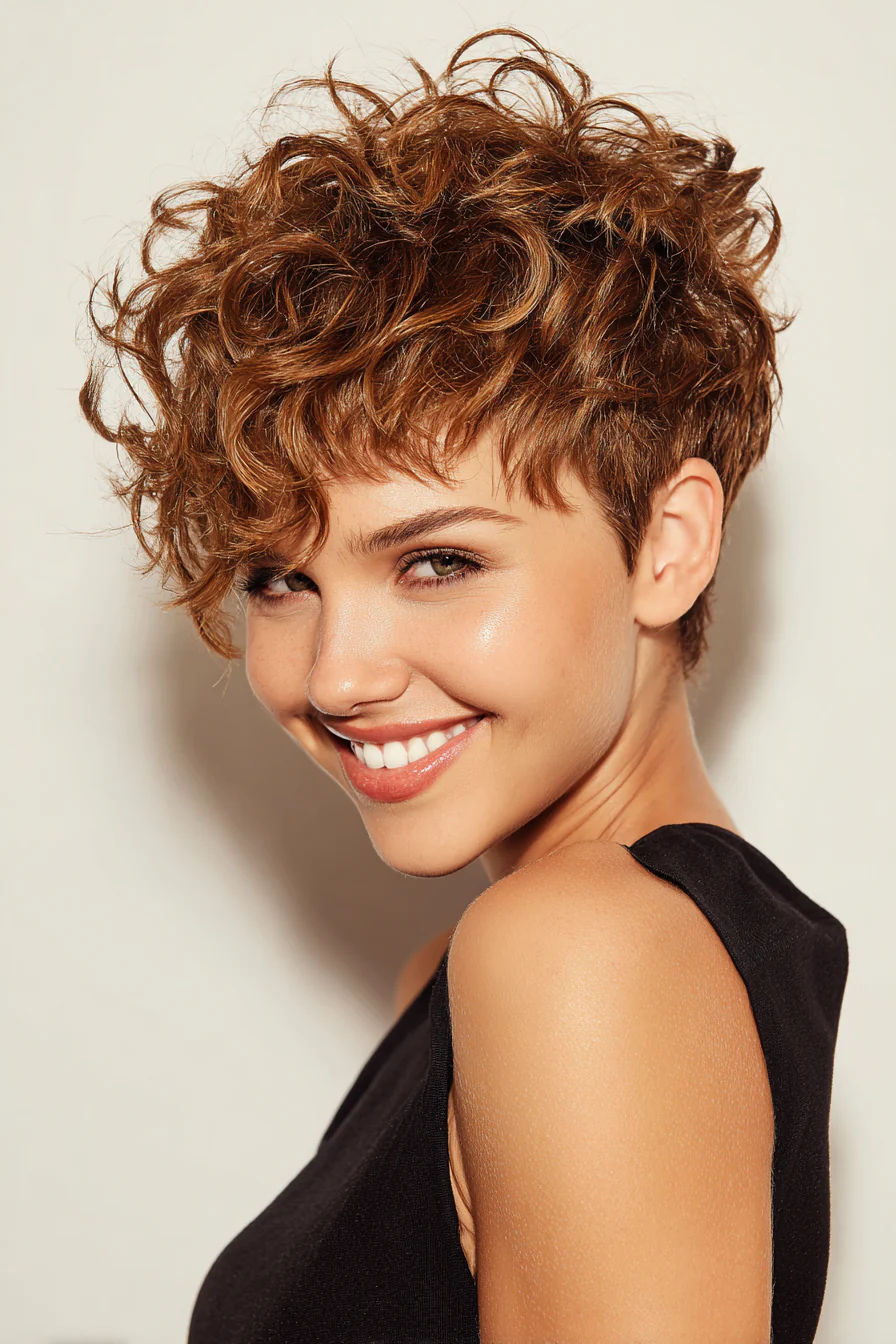 Кудри уходят в боковой объём, а чистая зона сбоку добавляет контраста. Медовый шатен смягчает линии и даёт красивый свет на завитке. Хорошо смотрится, если хочется открытого лица и выразительных скул.