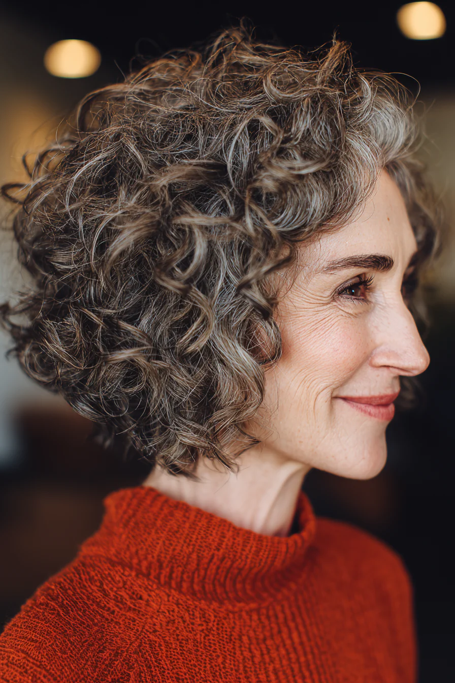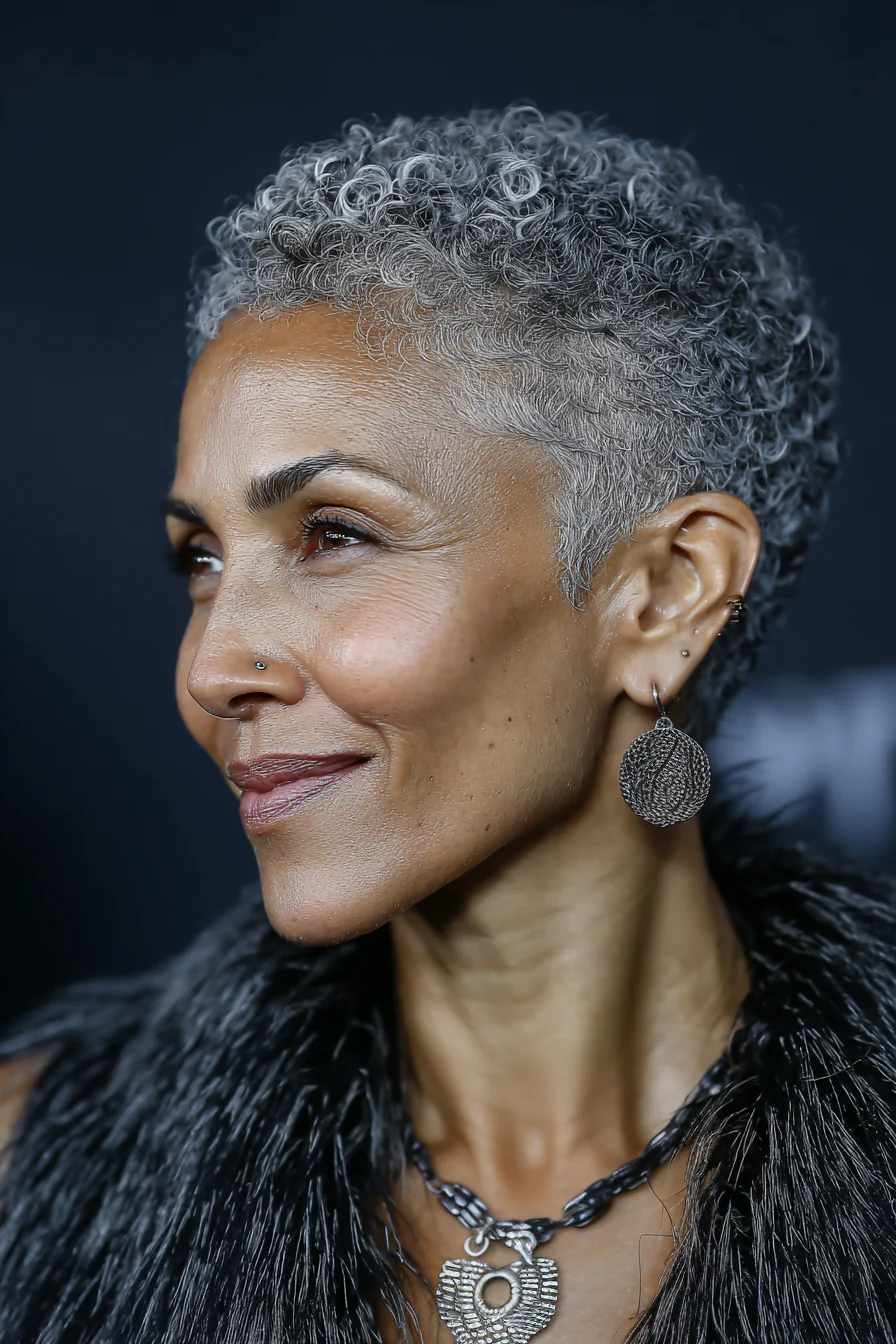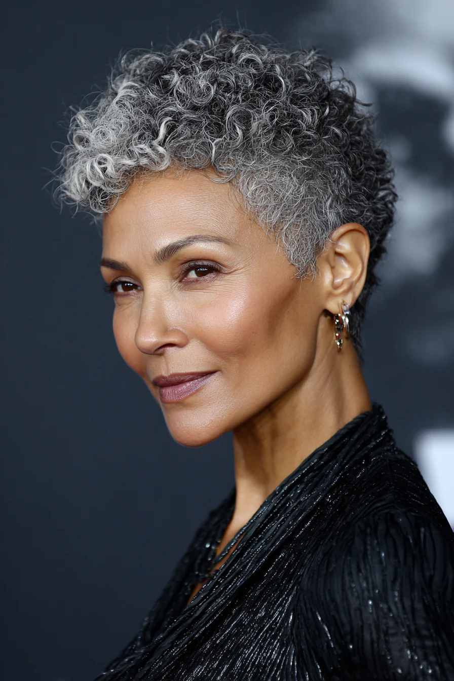 Коротко на затылке, больше объёма на макушке, форма подчёркивает красивую «шапку» завитка. Серебристо-серый выглядит статусно и очень современно, без попыток что-то прятать. Стрижка особенно идёт тем, кто хочет подчеркнуть фактуру и линию шеи.