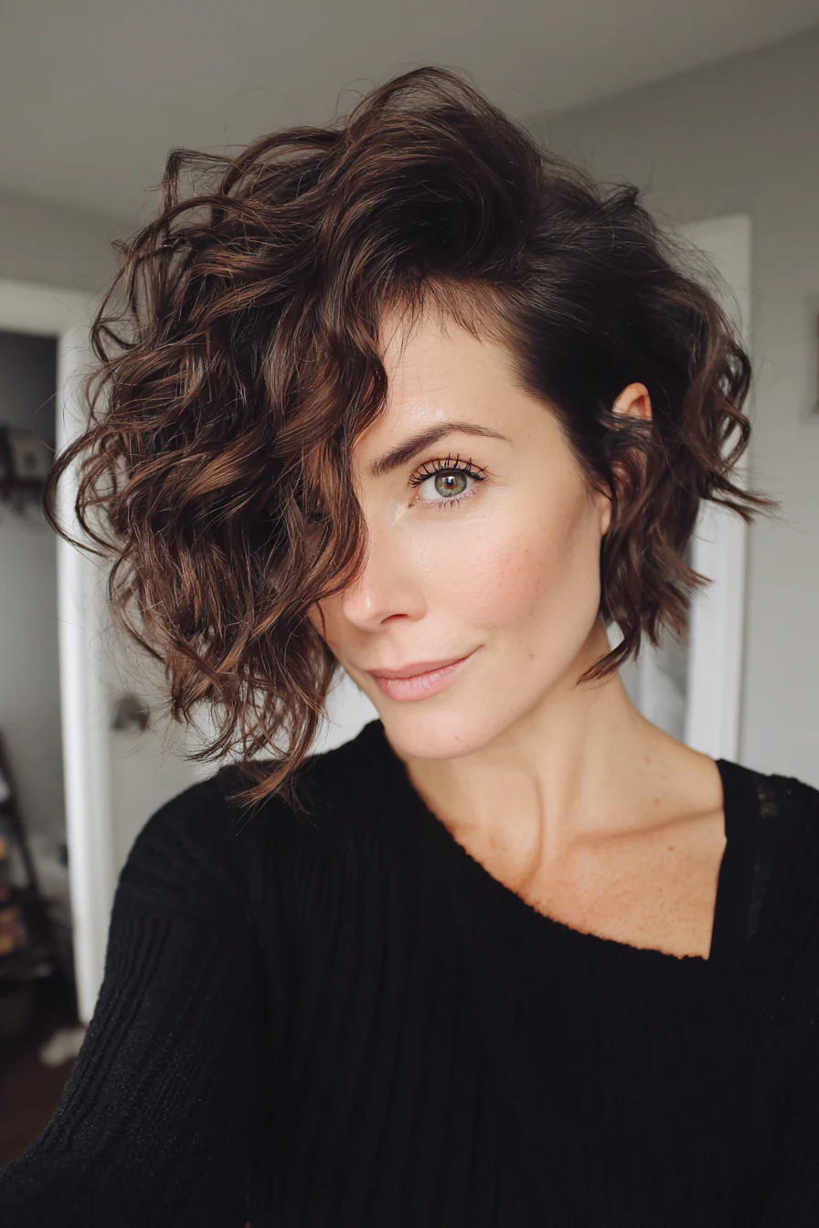 Одна сторона короче, другая оставлена длиннее и кудрявее, за счёт этого получается драматичный, но носибельный контраст. Тёмный шоколад делает форму более собранной. Вариант для тех, кто любит акценты и не боится асимметрии.