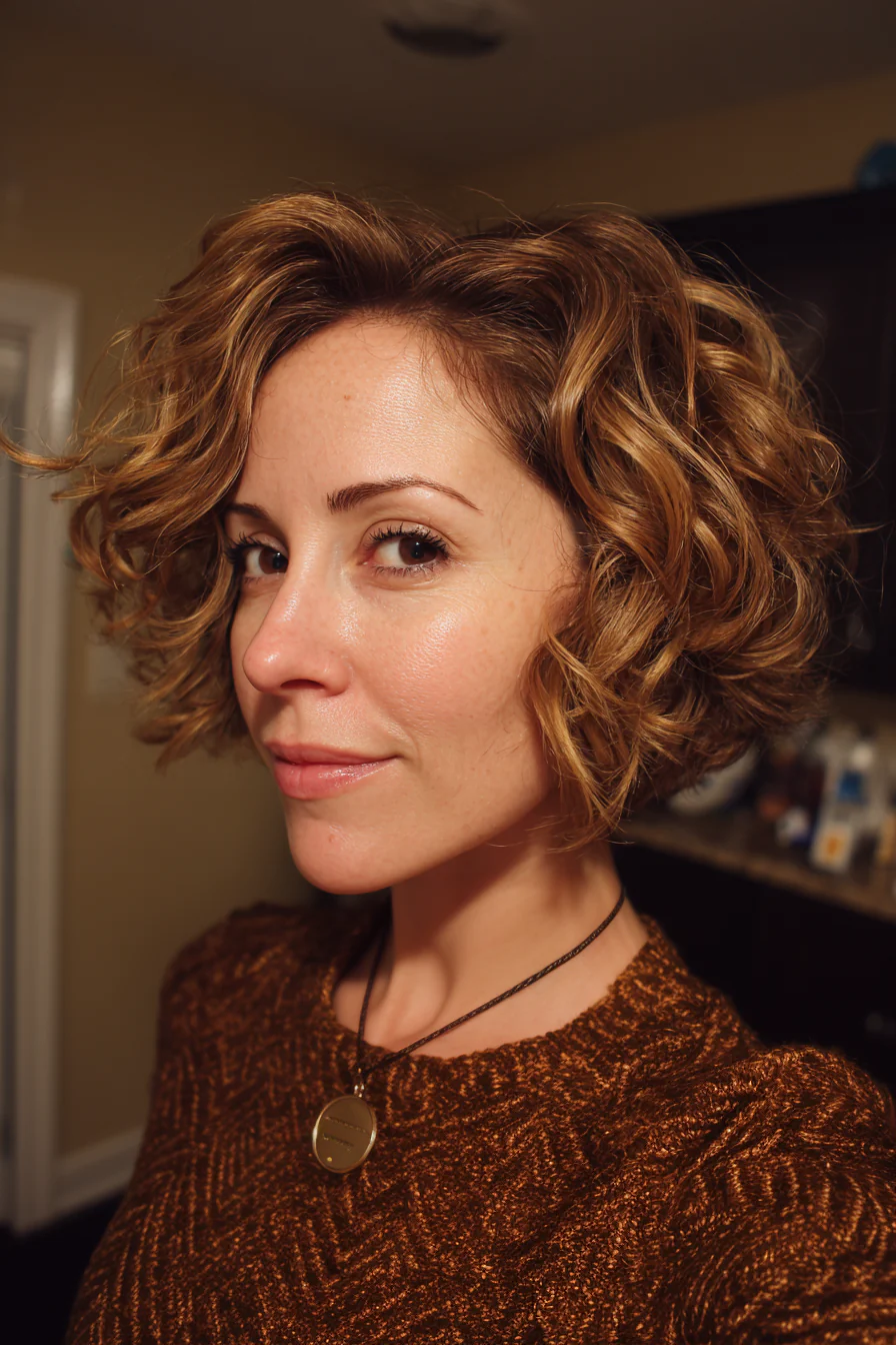 22. Инвертированный кудрявый боб (с удлинением у лица), золотистый каштан