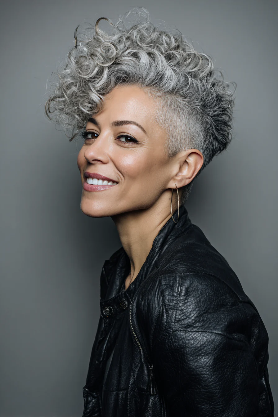База коротко «под машинку», сверху оставлены слои кудрей, которые дают объём и характер. Пепельно-серый оттенок добавляет модной прохлады и подчёркивает форму. Идеально для тех, кто любит чистые линии и современную графику.