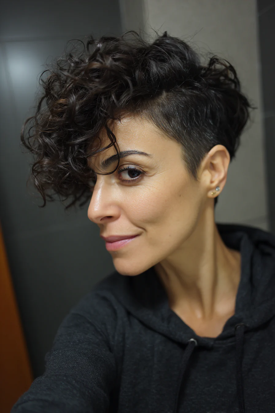 17. Пикси с кудрями, уложенными набок, плюс боковое выбривание, медовый шатен