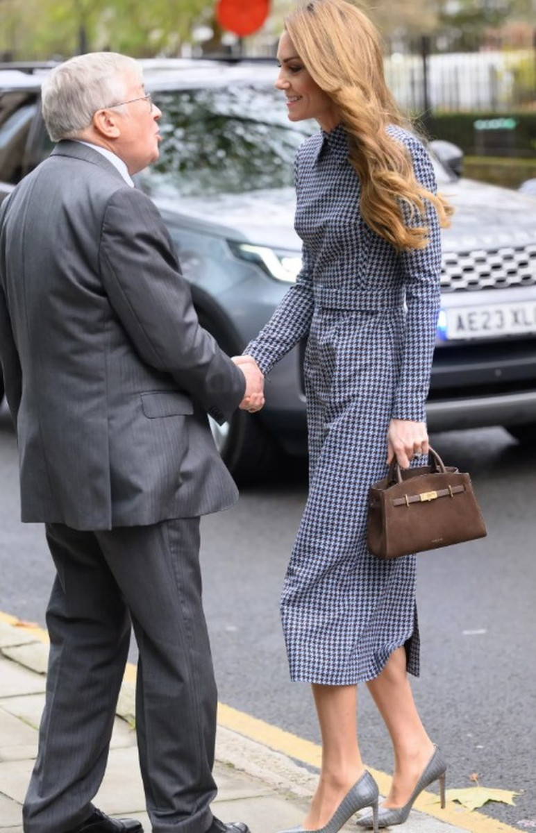 Принцесса Уэльская выбрала голубое платье и дополнила его серыми туфлями и мягкой бархатной сумкой шоколадного оттенка - идеальный пример игры на контрасте фактур.