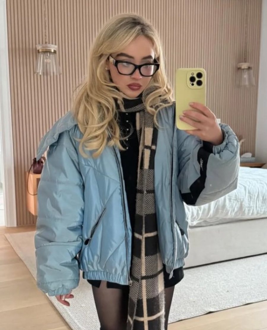 Сабрина Карпентер сочетает ледяной голубой верх с чёрной мини-юбкой, тонкими колготками и тёплым шарфом - лаконично, ярко и по-зимнему.