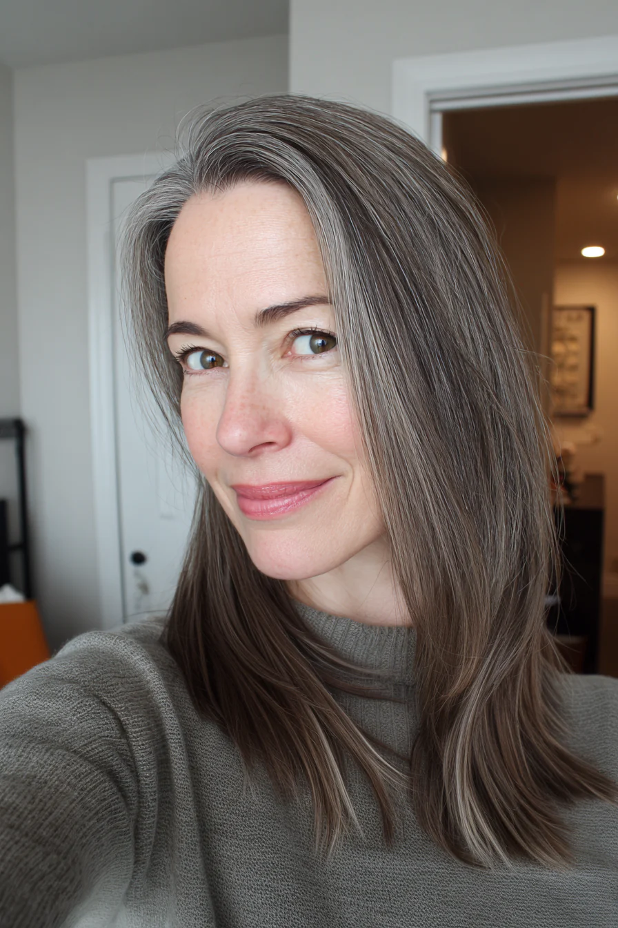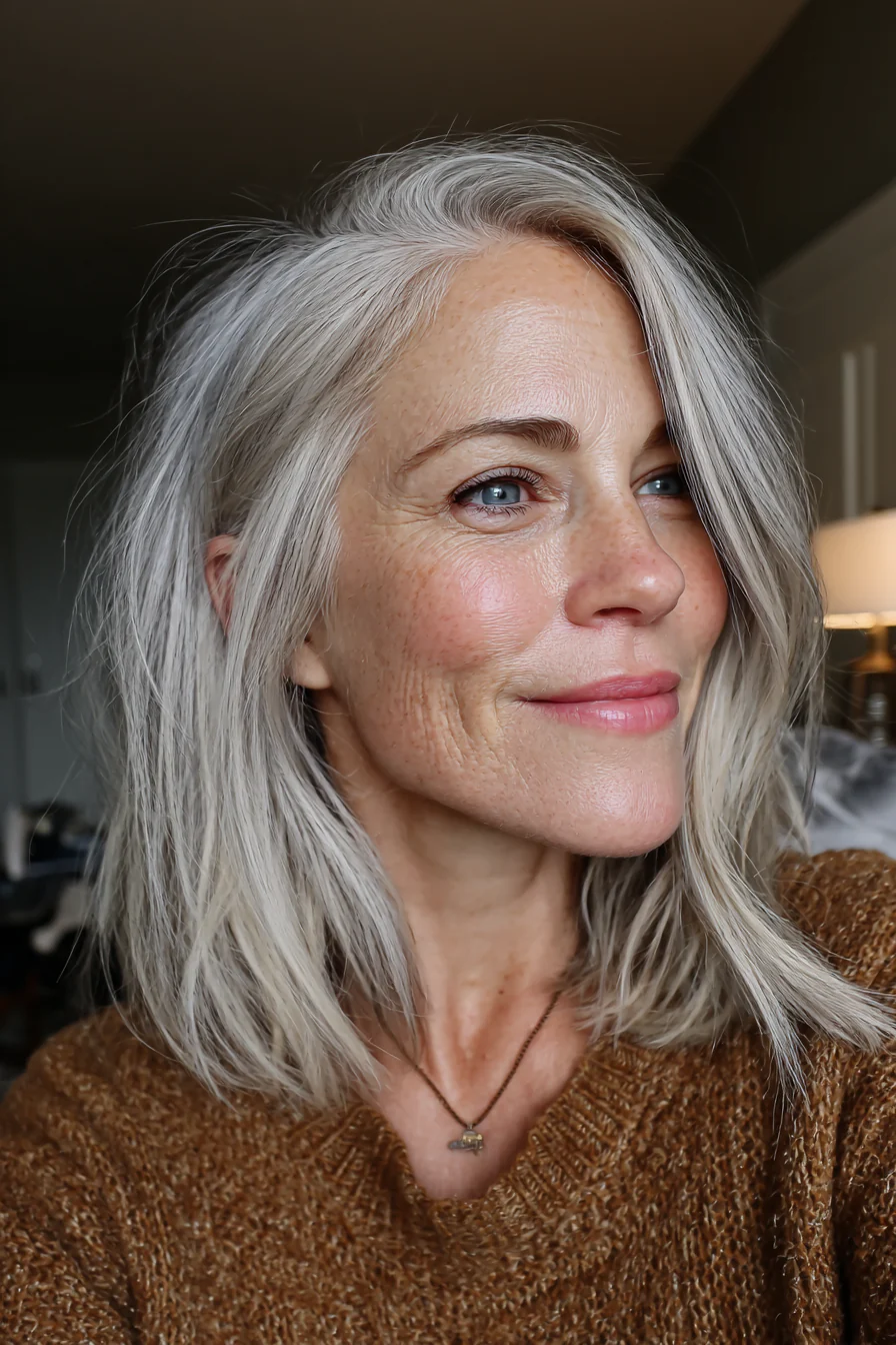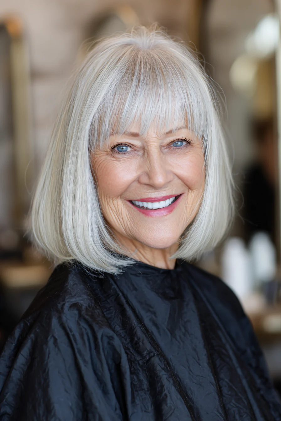 Ровная линия отлично работает на прямых волосах, создаёт ощущение густоты и симметрии. Боковой пробор добавляет элегантности и помогает приподнять корни. Натуральный серый оттенок выглядит особенно эффектно, если волосы хорошо увлажнены и блестят.