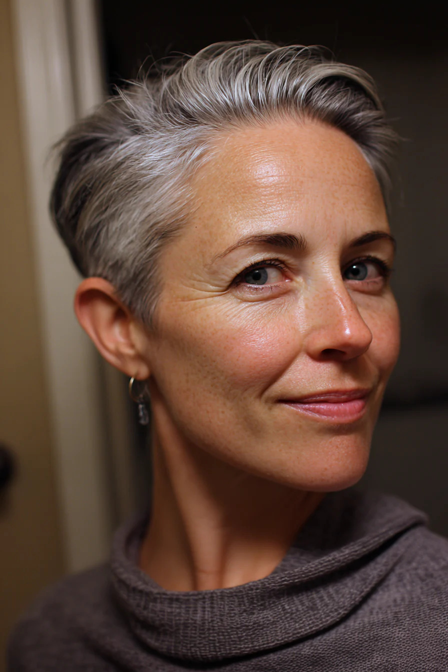Короткая форма с приподнятой макушкой даёт визуальную высоту и лёгкость, особенно если волосы тонкие. Натуральный серый цвет выглядит современно, если есть мягкая текстура и ухоженный блеск. Укладка: капля мусса у корней и сушка, приподнимая макушку.