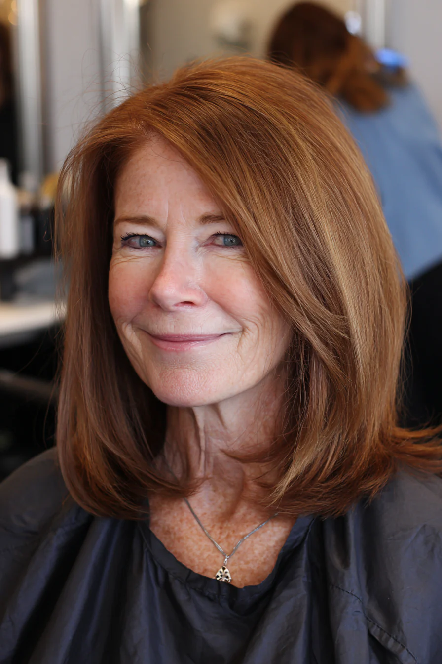 Чёлка-шторка мягко раскрывает лицо и легко вписывается в прямые волосы, особенно если концы аккуратно профилированы. Каштаново-рыжий тон добавляет энергии и делает образ ярче без лишней резкости. Хороший вариант, если хочется «цвета», но без экстремальных решений.