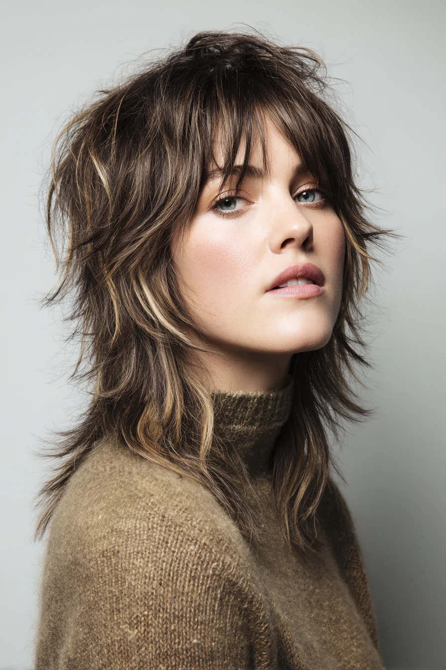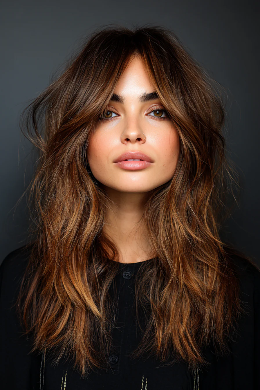 Длинные перистые слои разбивают плотность и дают воздуху проходить по длине. Шэг держит расслабленную форму, а тёплый коричный брюнет добавляет глубину и объём, не утяжеляя образ.