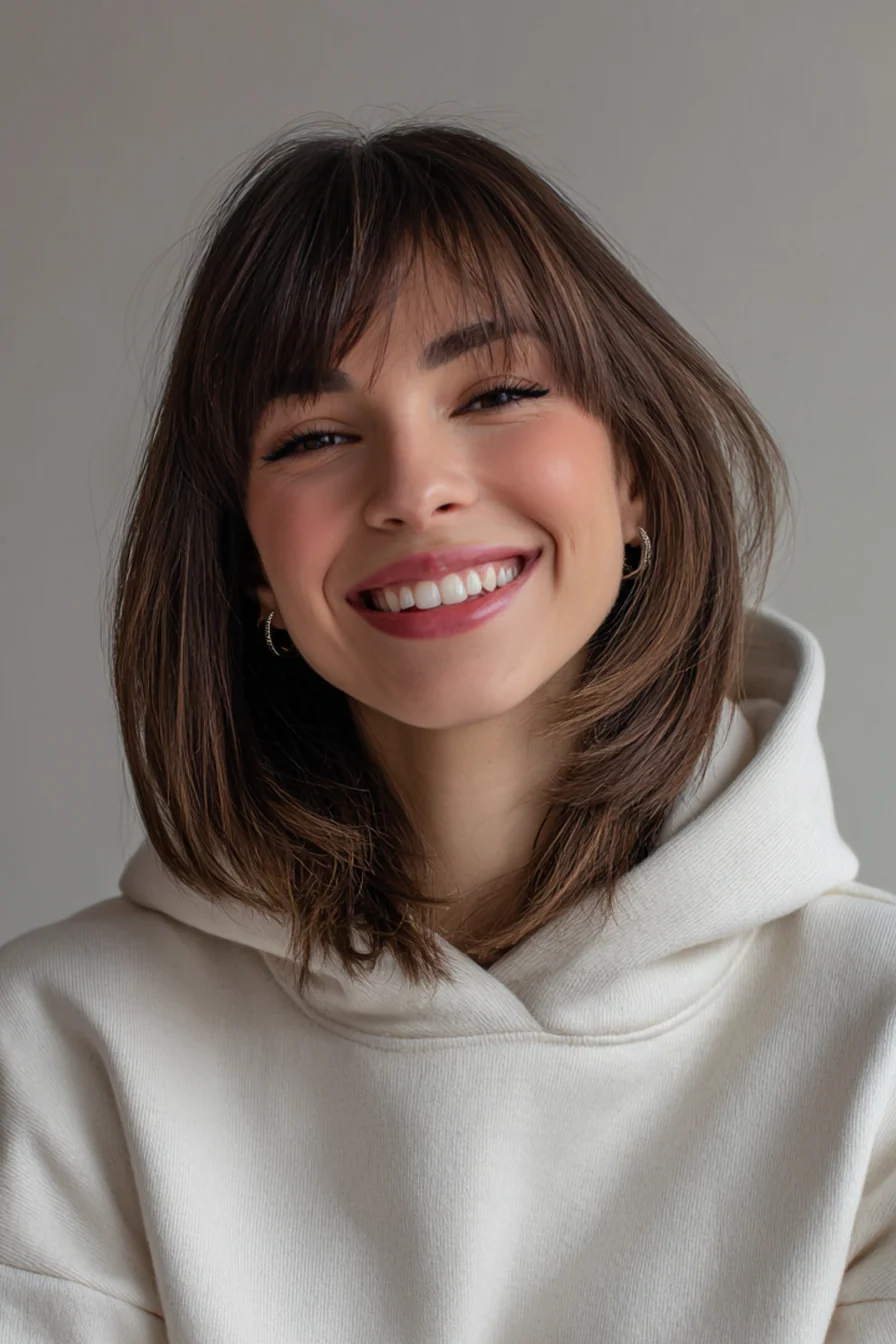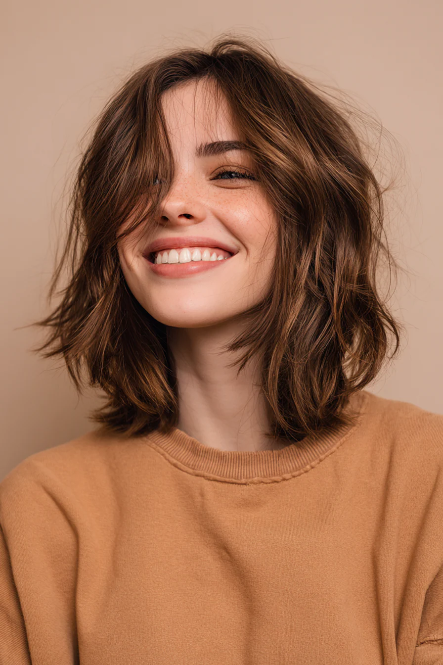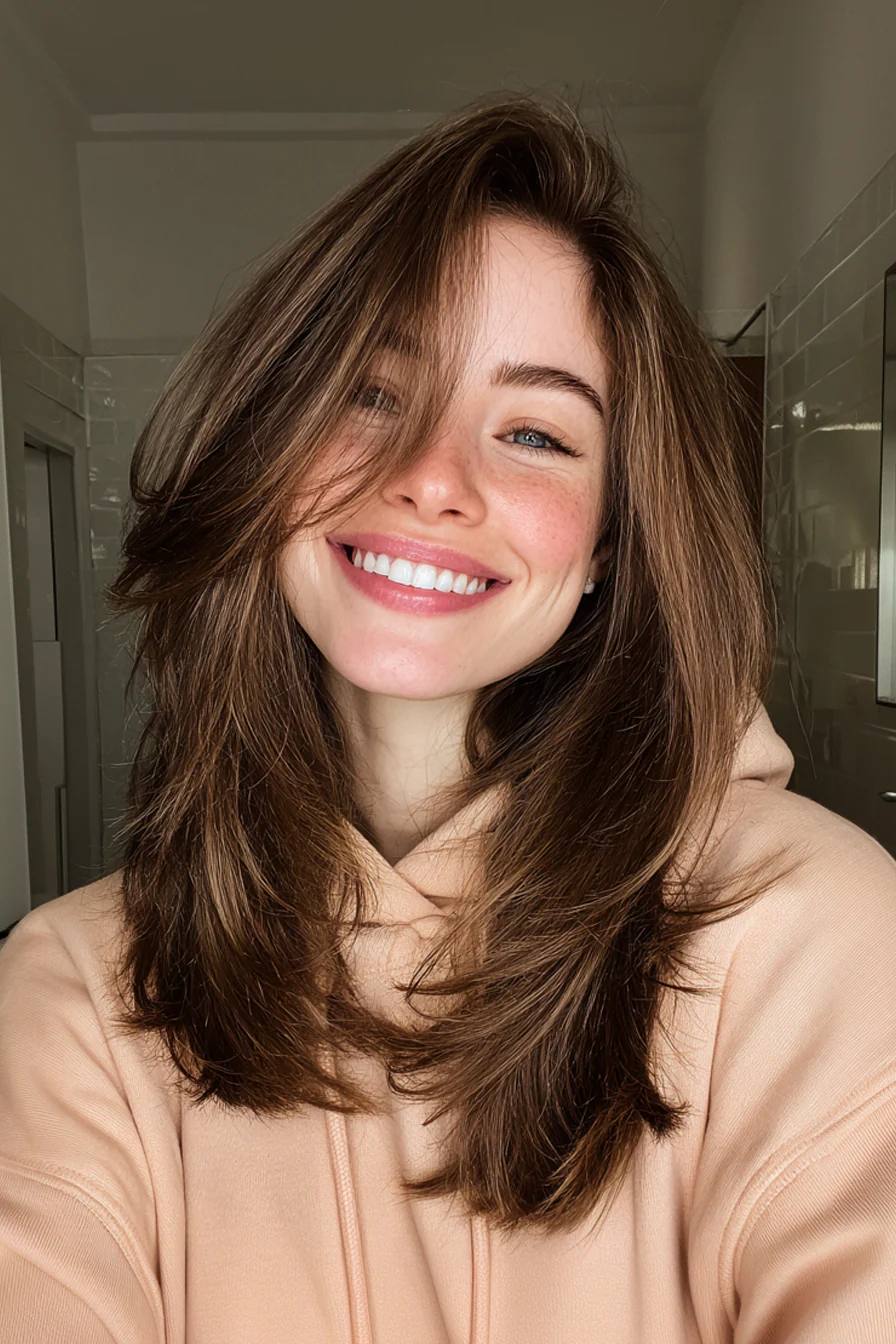 Слои у лица снимают вес спереди и красиво обрамляют черты. Каштановый оттенок добавляет мягкости и глубины, подчёркивая движение волос.