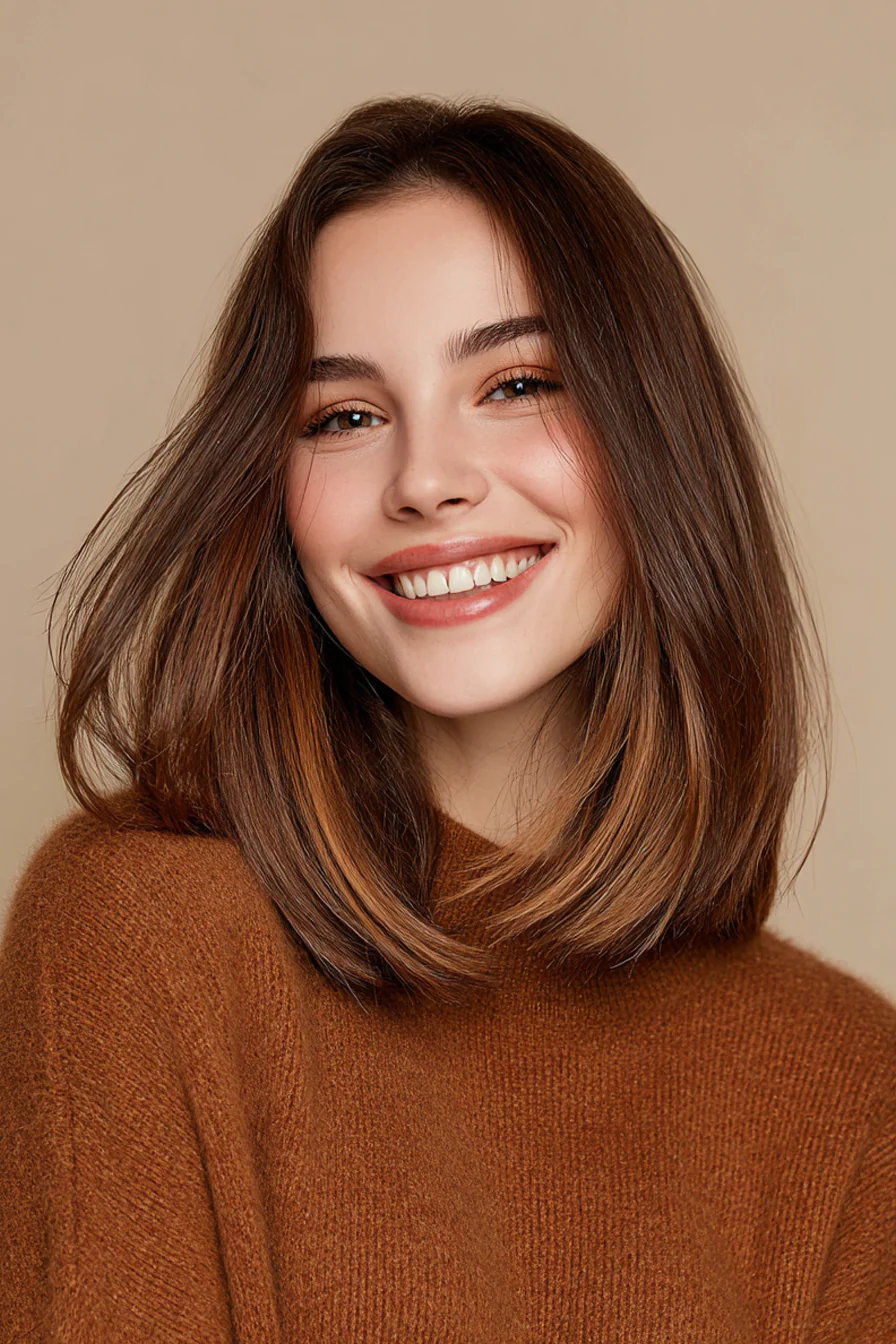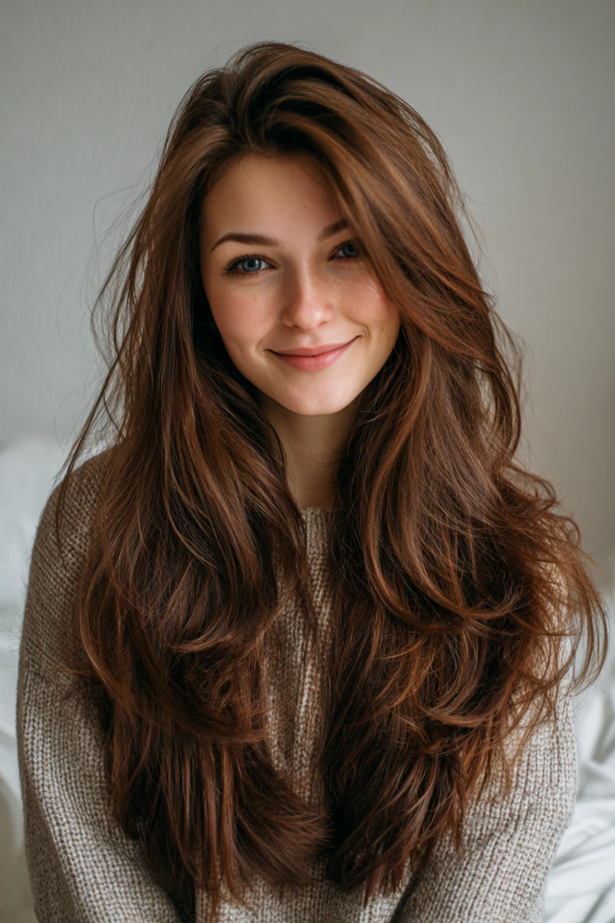 Тонко проработанные концы дают ощущение лёгкости, даже если волос много. Тёплый коричневый оттенок добавляет мягкое объёмное свечение.