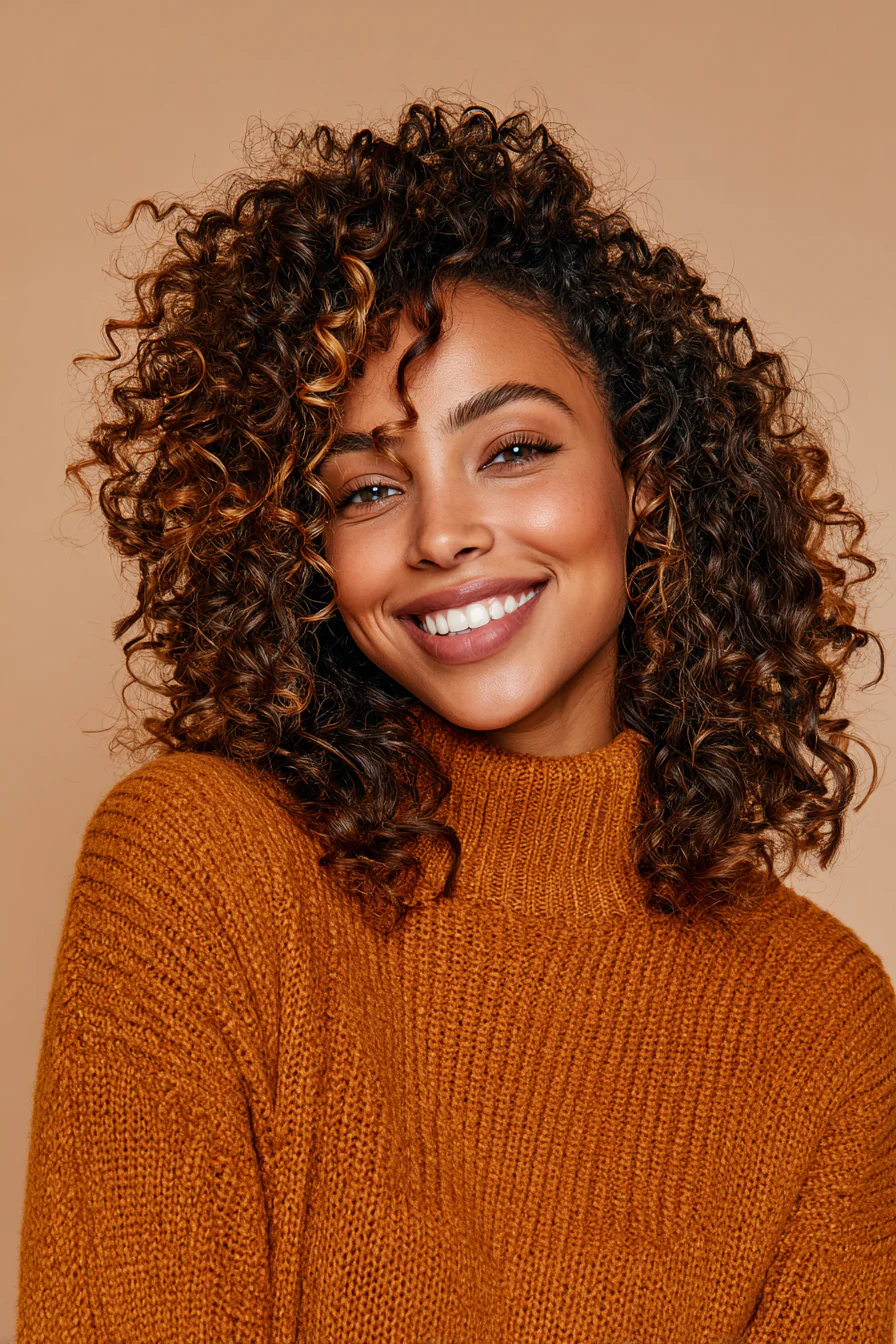 На густых кудрях слои помогают держать форму и не превращать объём в «шар». Карамельные пряди подсвечивают завиток и делают рисунок локона чище.