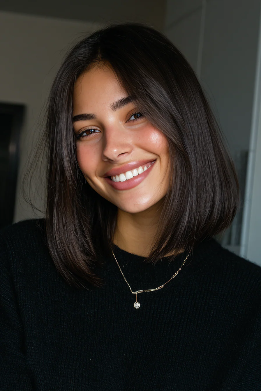 Чёткий прямой срез помогает густым волосам держать графичную форму и выглядеть ухоженно. Тёмный эспрессо добавляет блеск и ощущение дорогой простоты.