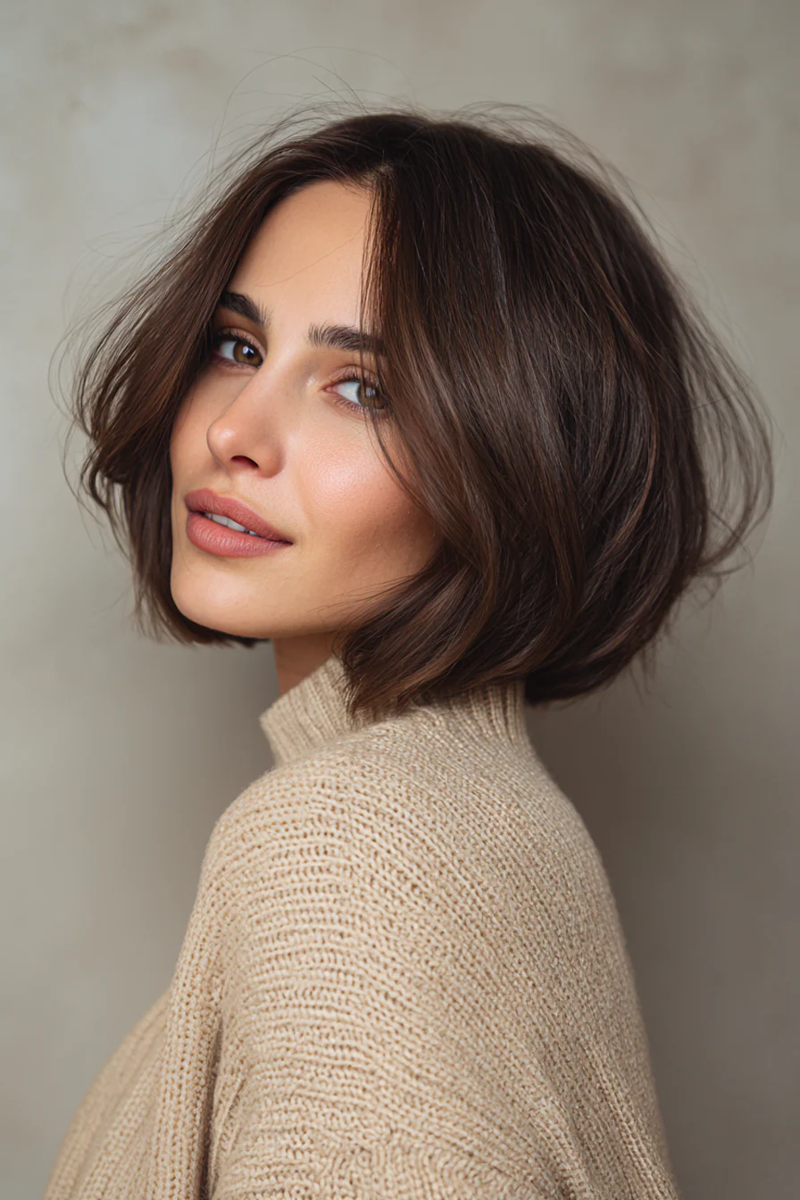 Лёгкое удлинение к лицу задаёт направление и визуально вытягивает линию. Шоколадный оттенок добавляет плотности и выглядит классически, но современно.