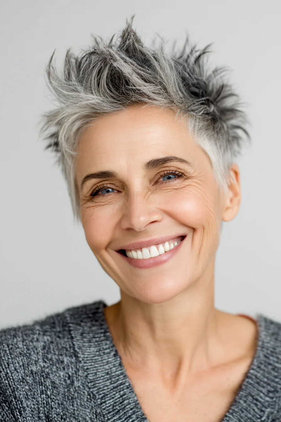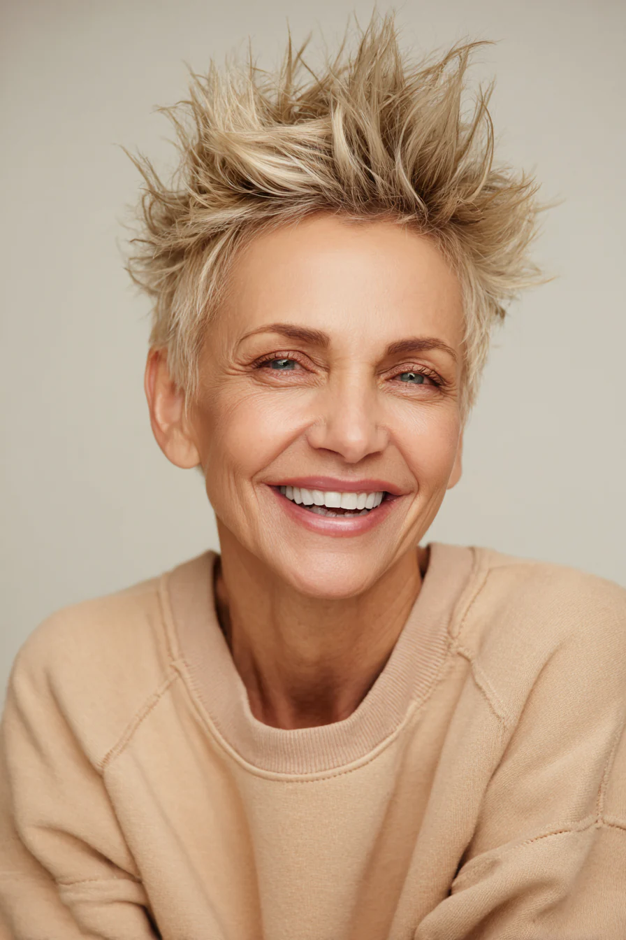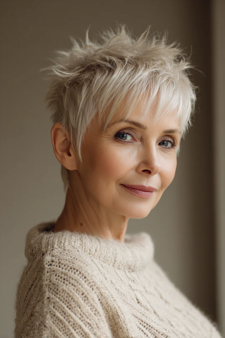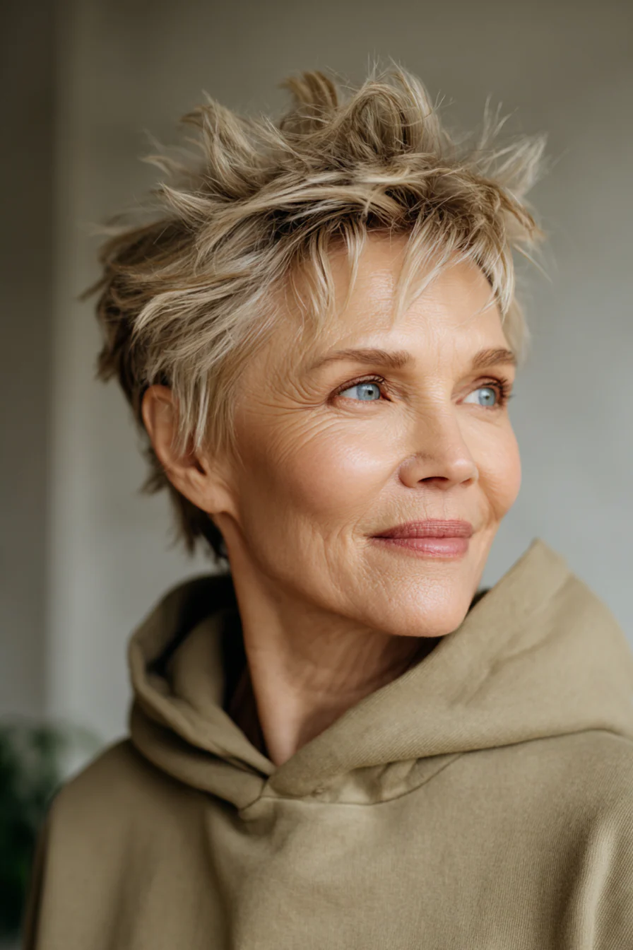 Короткие стрижки с приподнятыми прядями умеют делать то, что особенно ценно после 60: добавлять высоту там, где волосы начинают терять объём, и убирать лишний вес там, где он утяжеляет черты. Они практичны, но не скучны. Структурные, но живые. И, что важно, ускоряют утренние сборы, потому что выглядят «уложенными» даже в расслабленном варианте.