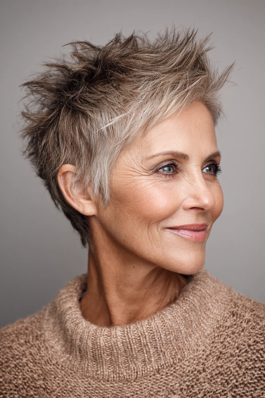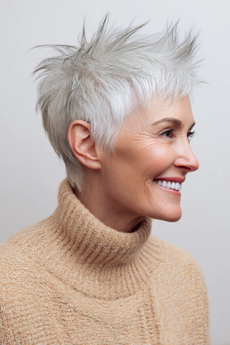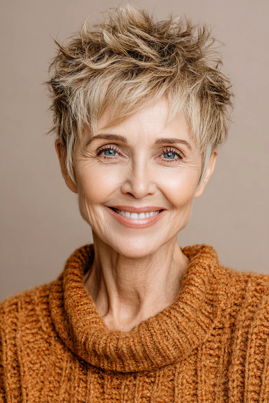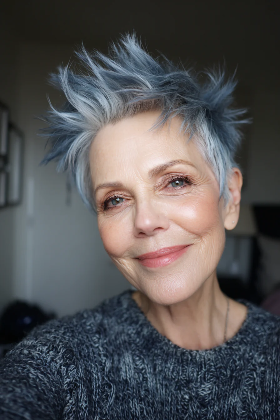 Короткие стрижки с приподнятыми прядями умеют делать то, что особенно ценно после 60: добавлять высоту там, где волосы начинают терять объём, и убирать лишний вес там, где он утяжеляет черты. Они практичны, но не скучны. Структурные, но живые. И, что важно, ускоряют утренние сборы, потому что выглядят «уложенными» даже в расслабленном варианте.