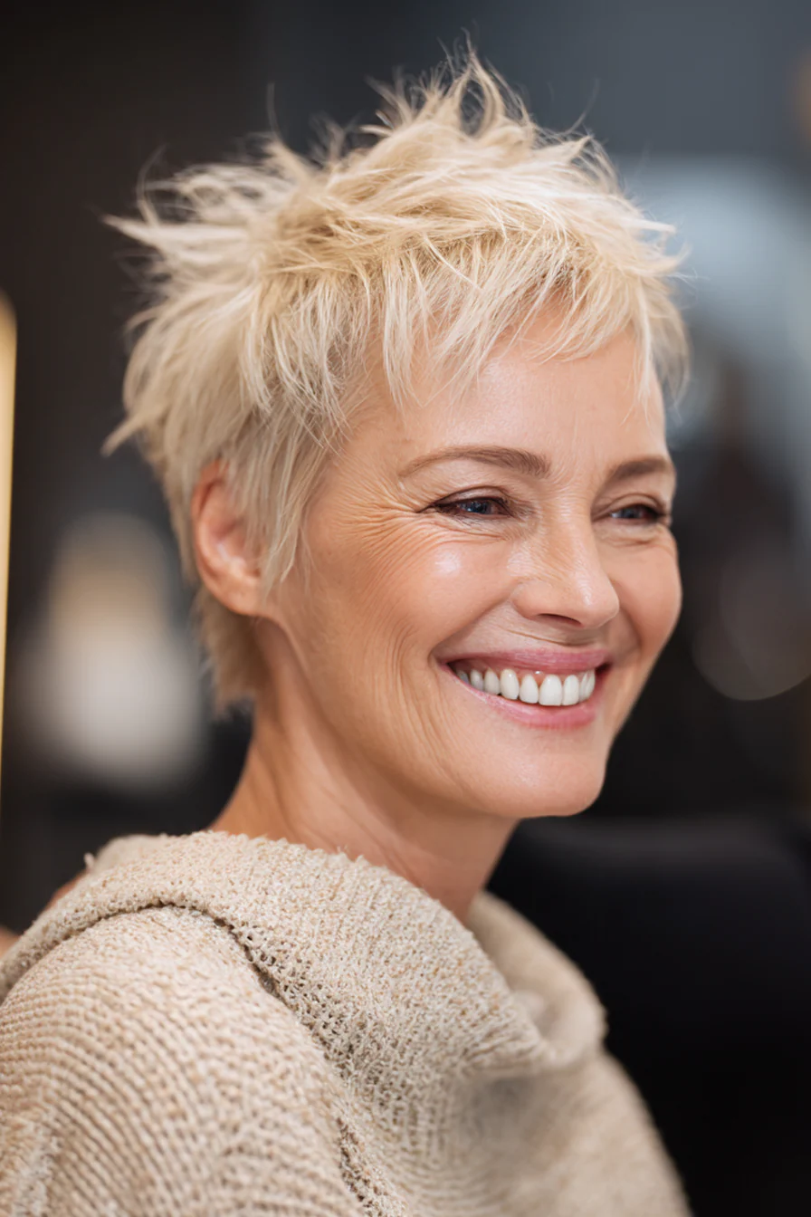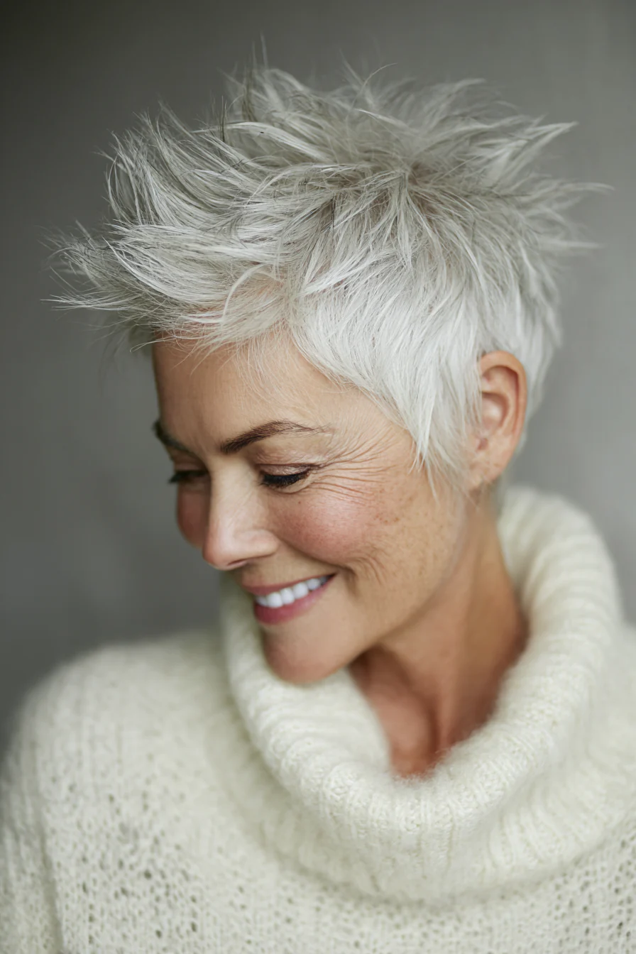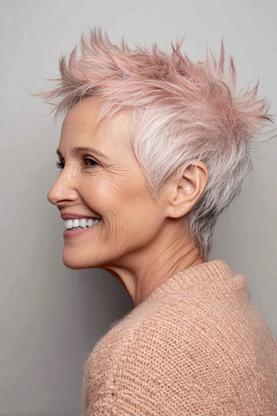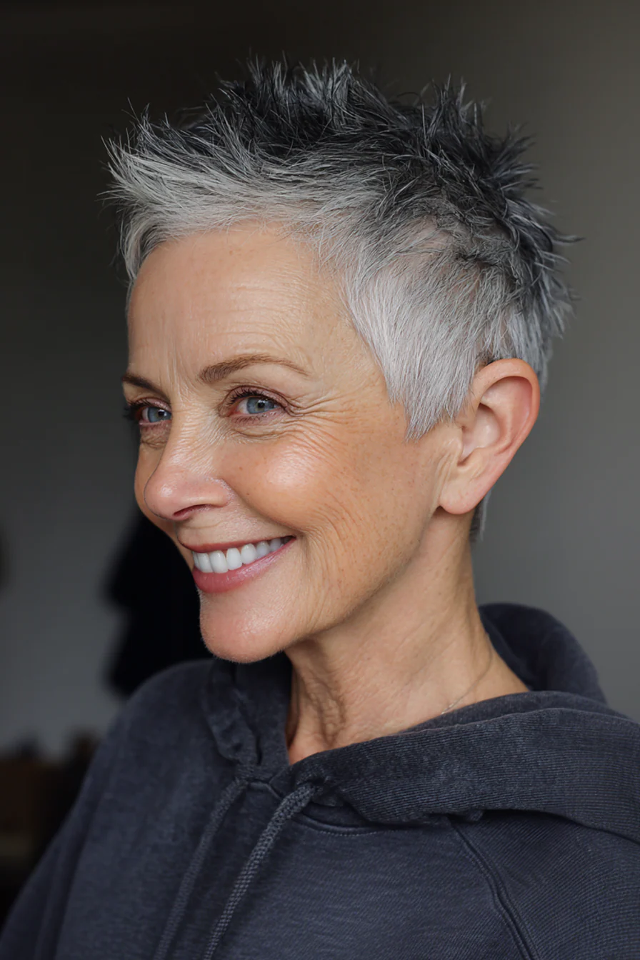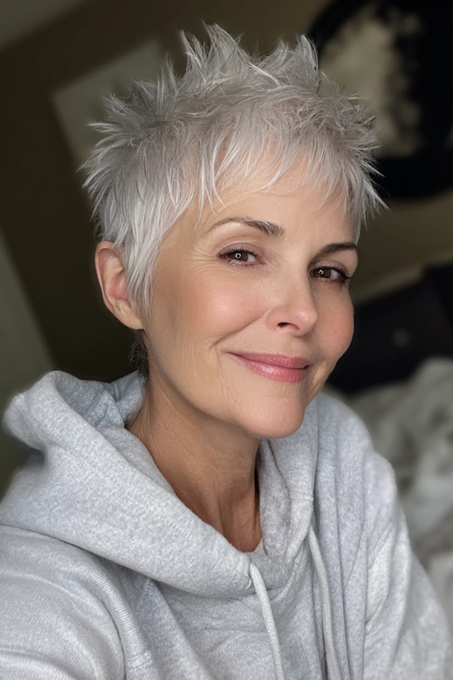 Короткие стрижки с приподнятыми прядями умеют делать то, что особенно ценно после 60: добавлять высоту там, где волосы начинают терять объём, и убирать лишний вес там, где он утяжеляет черты. Они практичны, но не скучны. Структурные, но живые. И, что важно, ускоряют утренние сборы, потому что выглядят «уложенными» даже в расслабленном варианте.