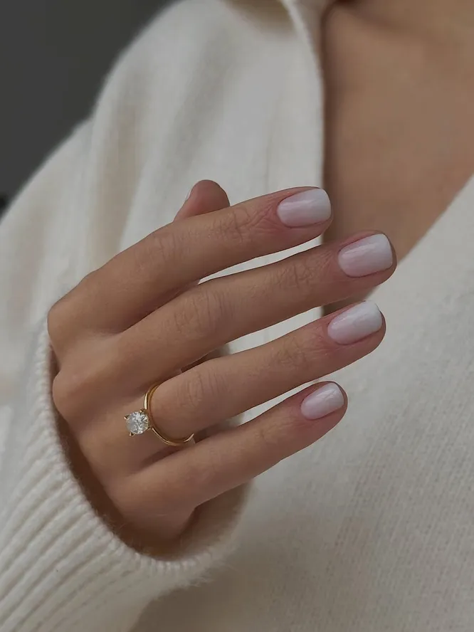 Квадратная форма здесь работает как рамка для спокойного оттенка. Молочное покрытие перестаёт быть просто «нейтральным», и начинает выглядеть как продуманный выбор, чисто, собранно, ухоженно.