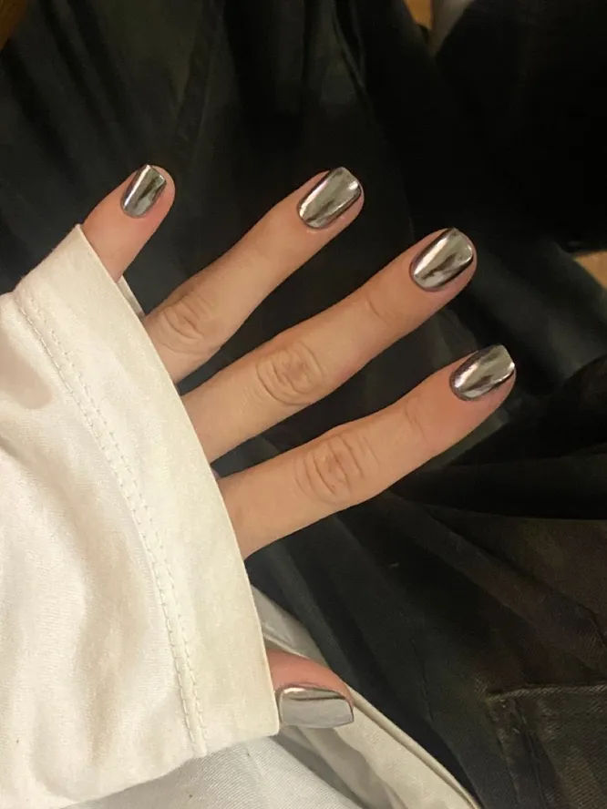 Хром и зеркальные покрытия любят квадрат, потому что геометрия делает эффект цельным. Получается ощущение аксессуара: как кольцо или серьги, которые собирают образ, даже если одежда очень простая.