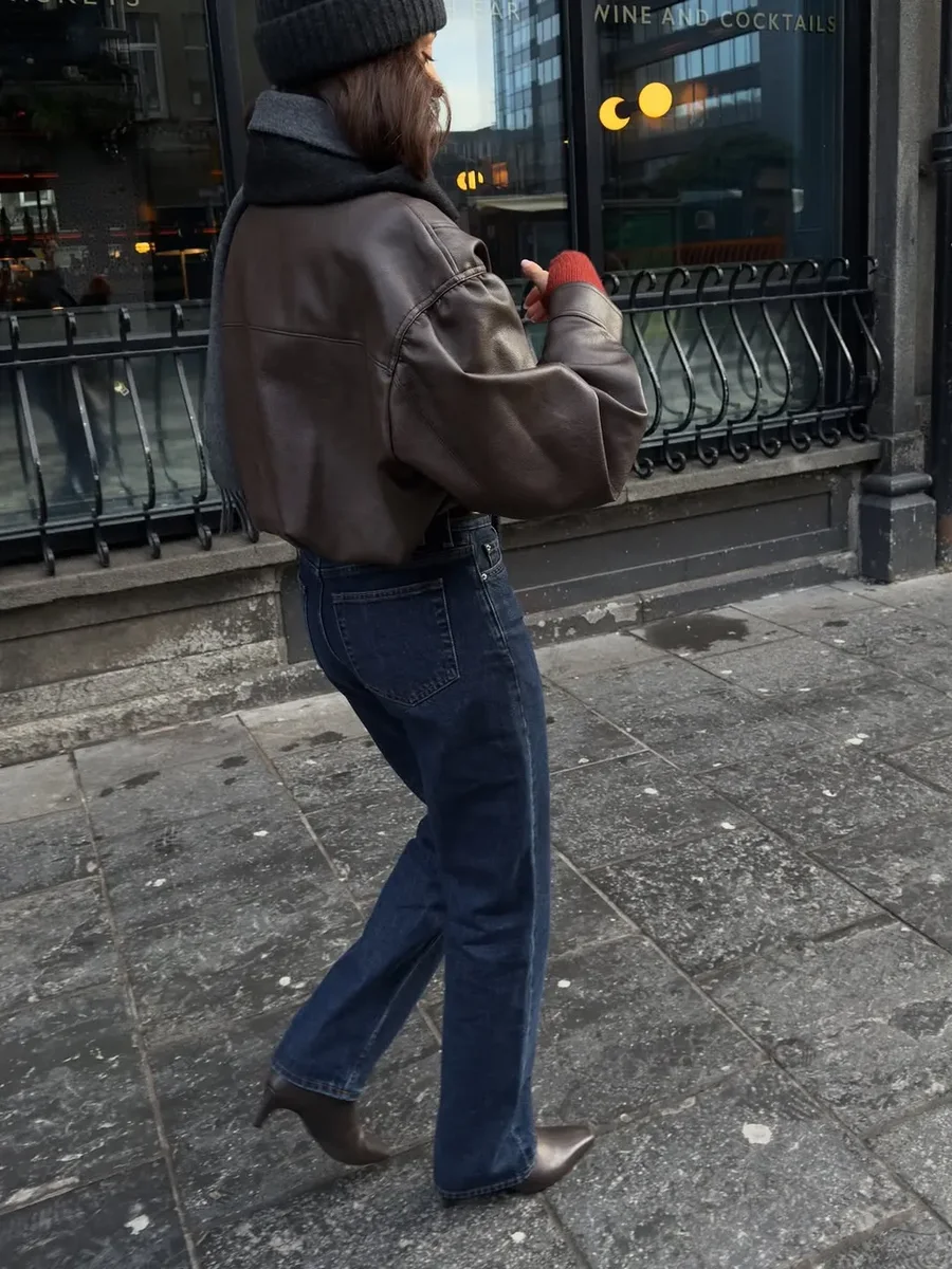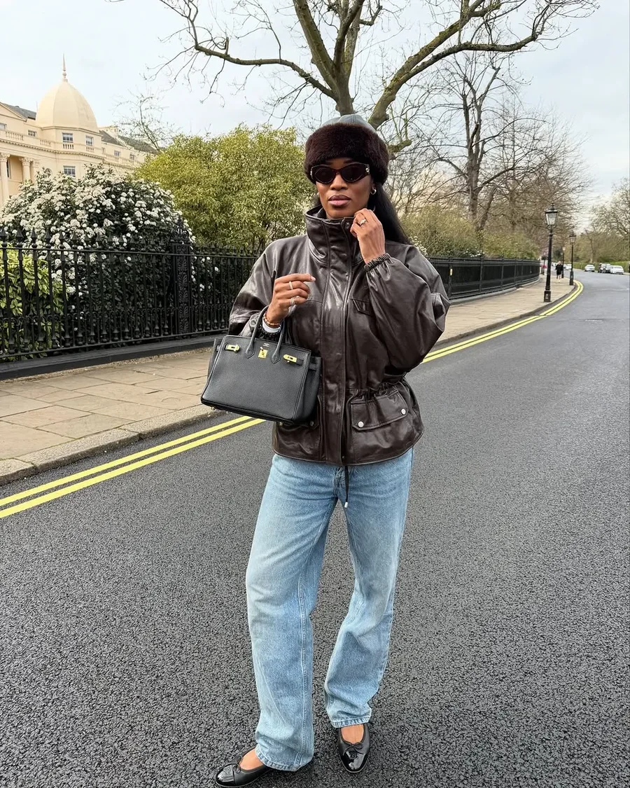 Бледно-голубые джинсы работают только в сочетании с более тяжёлыми фактурами: кожа, шерсть, структурированные пальто, мех.