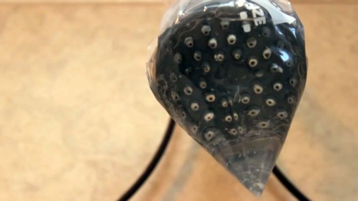 Аккуратно наденьте пакет на душевую лейку. Важно выпустить лишний воздух, чтобы форсунки полностью погрузились в жидкость.