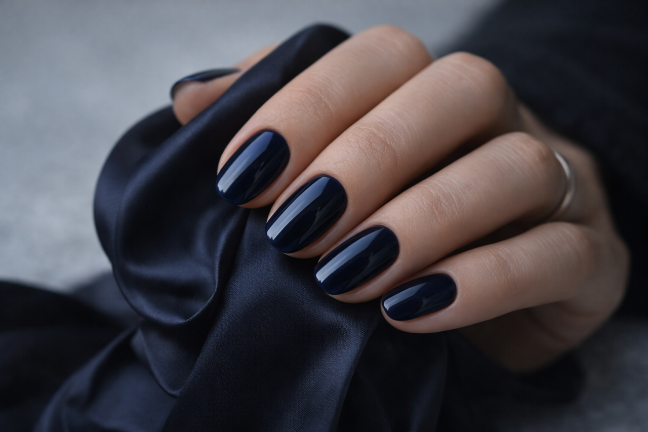 Когда хочется тёмного оттенка, но бордо уже «переносили», февраль отдаёт корону midnight blue. Он выглядит дороже чёрного, мягче графита и при этом даёт тот же эффект собранности. Vogue прямо называет midnight blue одним из первых больших трендов 2026, и отмечает, что он работает на любой длине и форме, включая короткий миндаль.