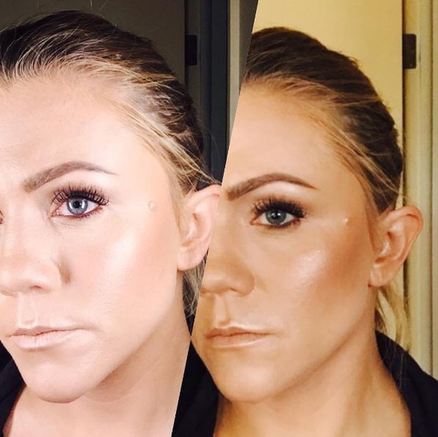 Тёмный оттенок по бокам и чуть хайлайтера по центру помогают создать более изящный контур. Важно хорошо растушевать и не переборщить со свечением.