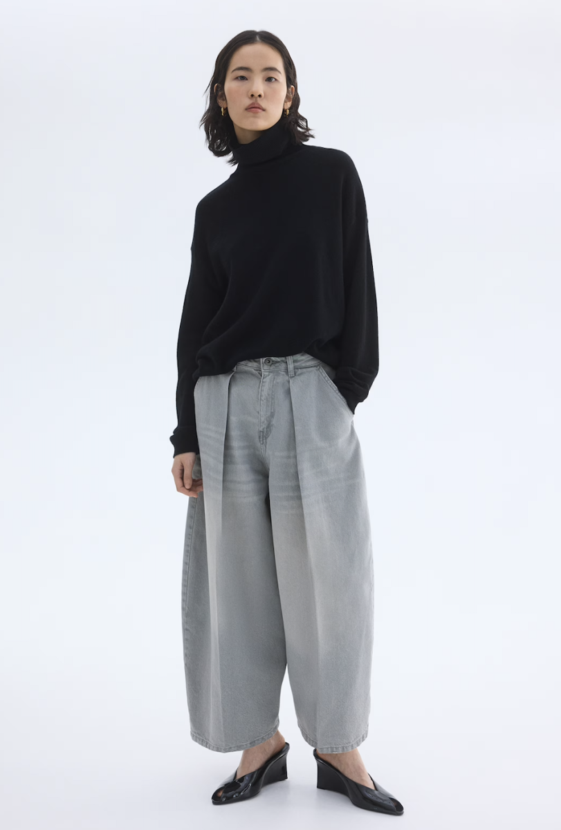 Оверсайз продолжает доминировать, но теперь он обретает более сложную форму. Брюки-баллоны и классические широкие штанины получили серьезного конкурента - джинсы-«бочки». Их свободный крой в области бедер плавно сужается к низу, создавая узнаваемый и стильный силуэт.