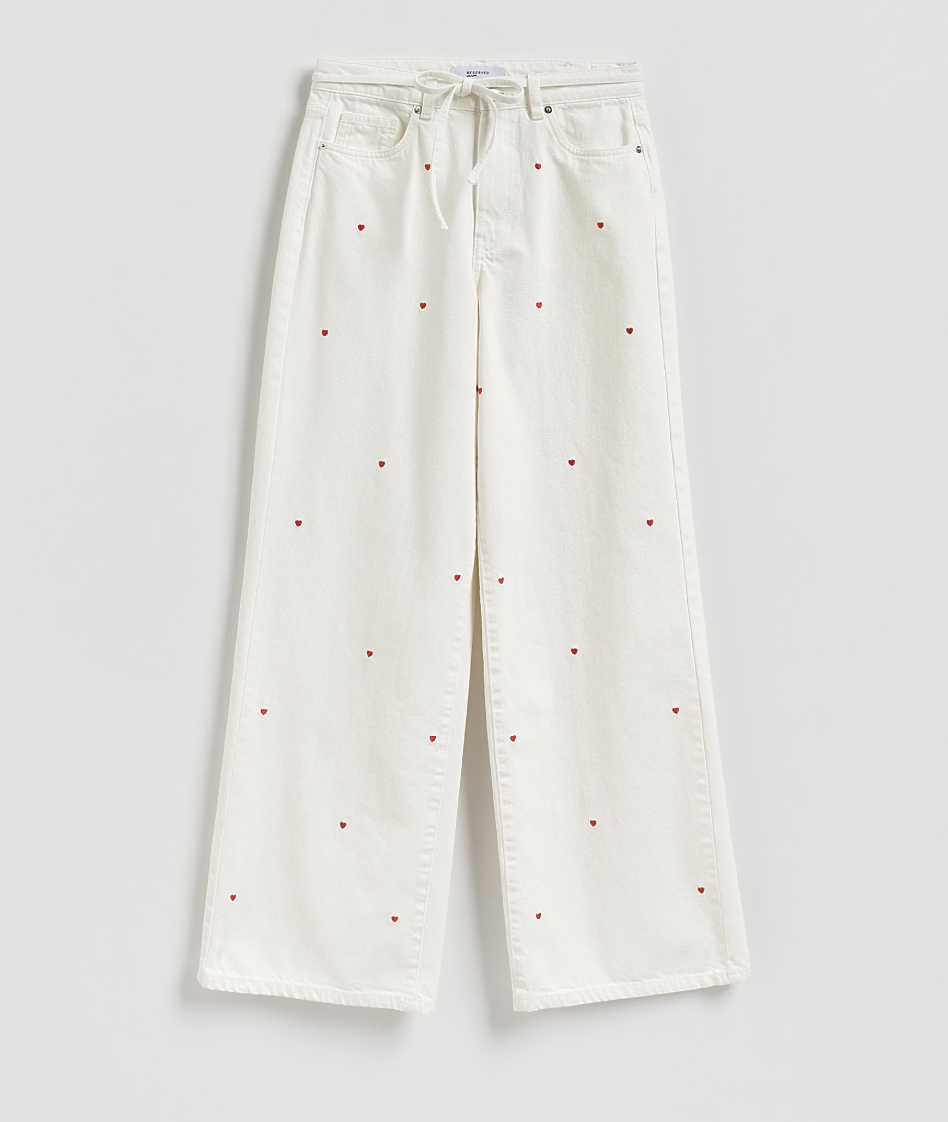 Романтика актуальна круглый год. Джинсы с широкими штанинами, украшенные россыпью крошечных вышитых сердечек, привносят в образ художественную легкость. Несмотря на игривый мотив, они легко вписываются в повседневный гардероб. Сочетайте их с однотонными блейзерами или лаконичными блузками - контраст строгого верха и трогательной вышивки выглядит максимально актуально. Практичный пояс в комплекте поможет идеально акцентировать талию.