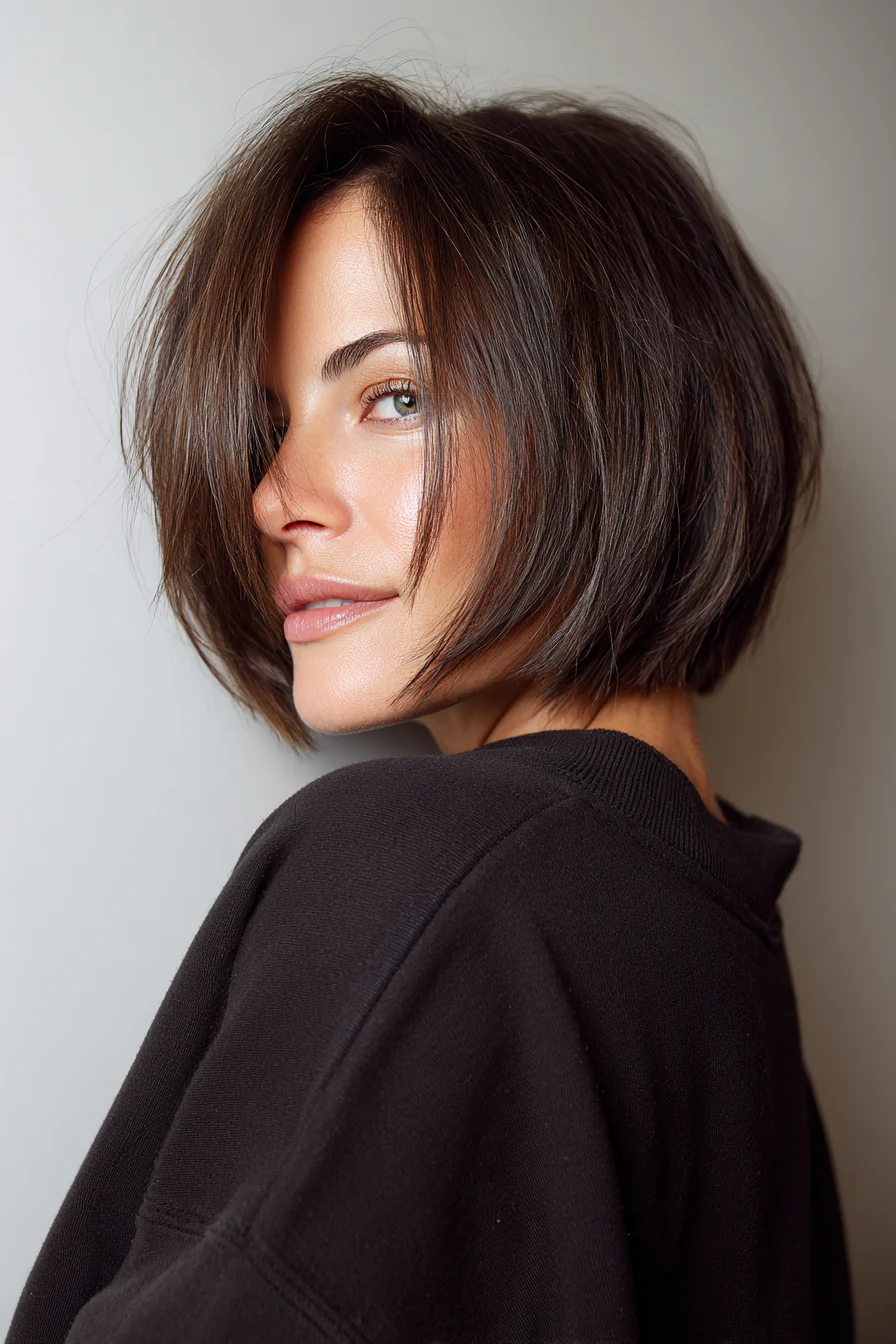 Лоб, он же лонг-боб, до ключиц с «невидимыми» слоями по концам даёт движение, но не забирает плотность. Глоссинг в оттенке mushroom brown, холодный серо-коричневый, визуально уплотняет полотно и добавляет зеркальный блеск.