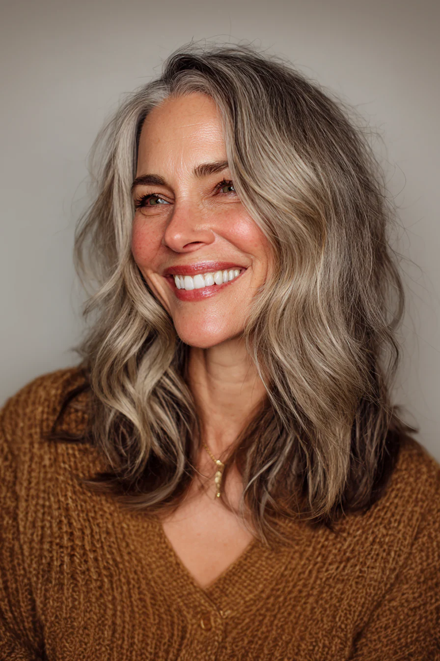 Длинные слои с «рамкой» у лица начинаются в районе скул, это визуально подтягивает и делает взгляд мягче. Медово-золотые блики работают как подсветка, особенно в дневном свете.