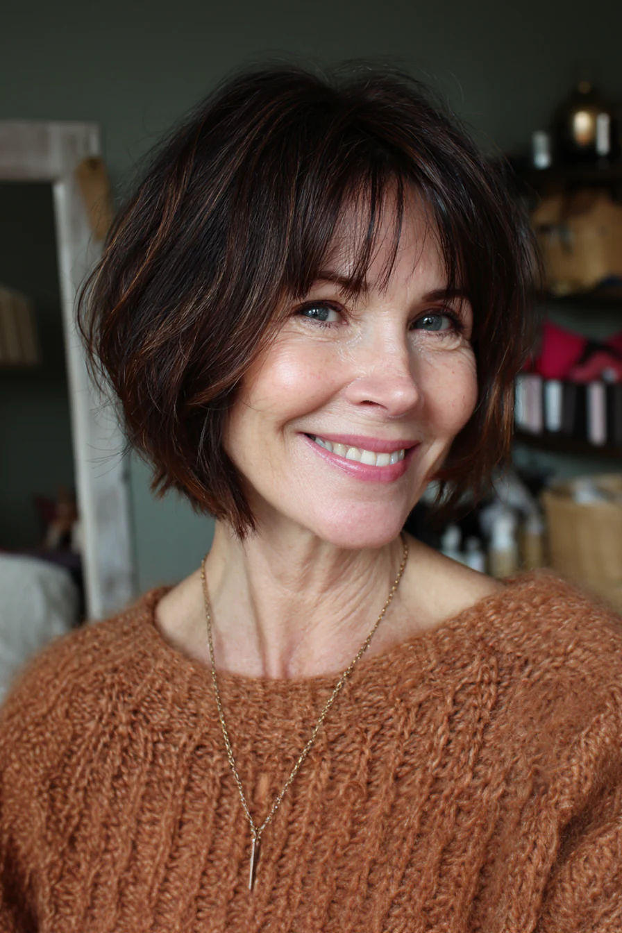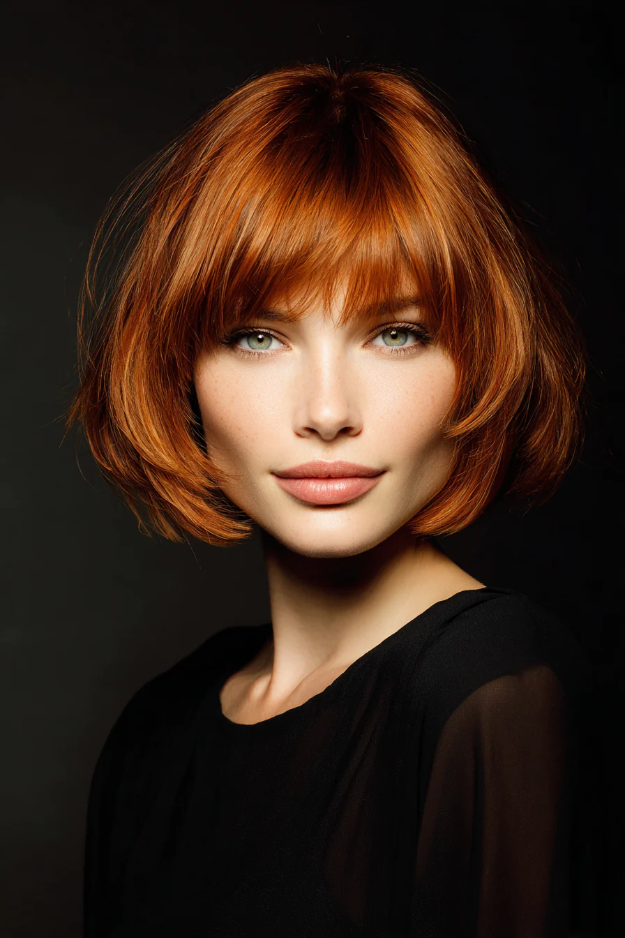 Шэг-боб это боб, но с воздухом, слои лёгкие, чёлка мягкая, объём получается естественный. Оттенок cinnamon copper, корично-медный, красиво согревает лицо и подчёркивает текстуру.