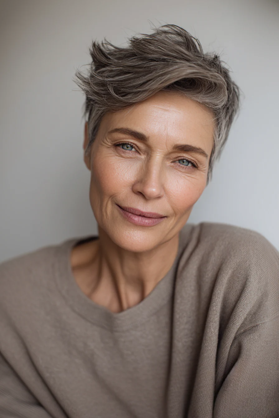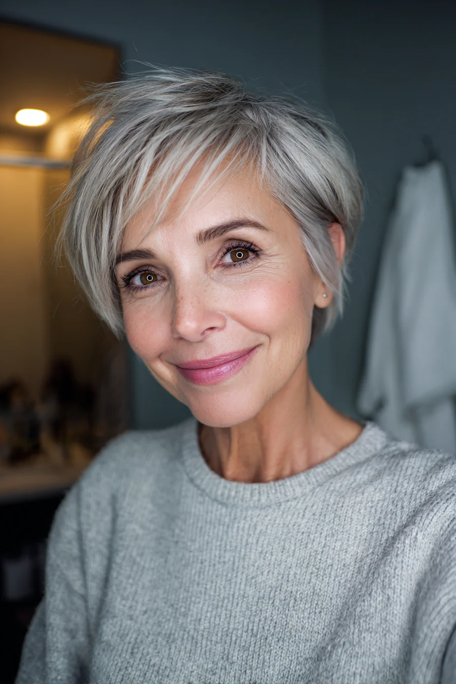 Пикси-боб это переходная длина, удобна тем, кто отращивает или не готов к ультракоротко. Мягкие слои по линии челюсти делают лицо нежнее, кремовый пепельный блонд выглядит чисто и не желтит.