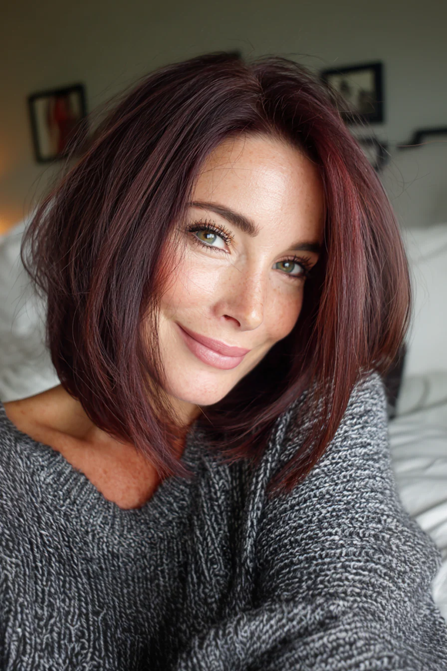 Angled lob, удлинение к лицу, вытягивает силуэт и делает образ собраннее. Тонирование в оттенке «блэк-черри», чёрная вишня, даёт благородный красный подтон без «пожарной» яркости.