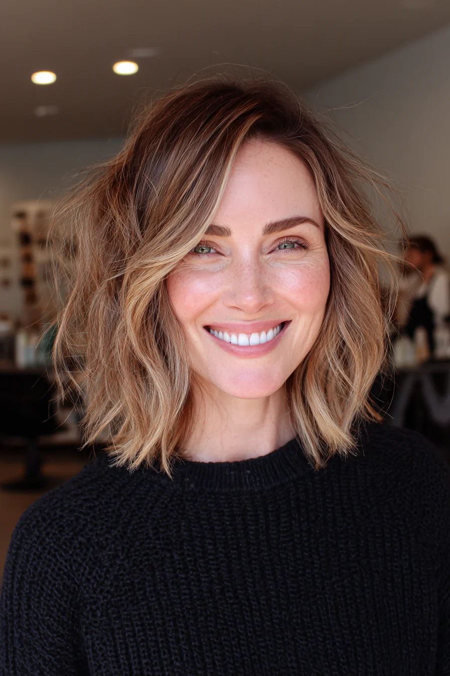 Чоппи-лоб это «кусочность» на концах, когда пряди читаются и дают современную небрежность. Бронд «тостированный миндаль» создаёт мягкий контраст, за счёт него форма выглядит объёмнее.