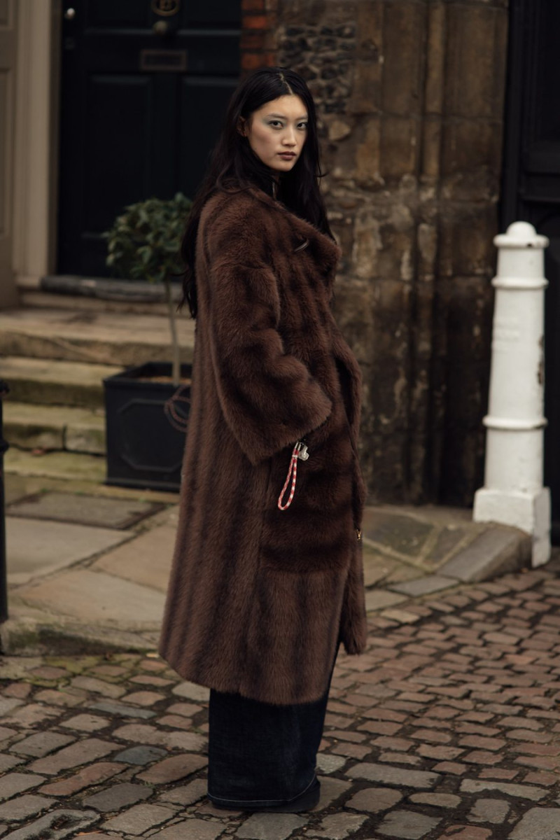 Объёмная меховая шуба тёплого шоколадного оттенка - главный акцент этого минималистичного ансамбля. Прямые тёмные брюки и лаконичная укладка подчёркивают силуэт и создают атмосферу интеллектуального стрит-стайла.